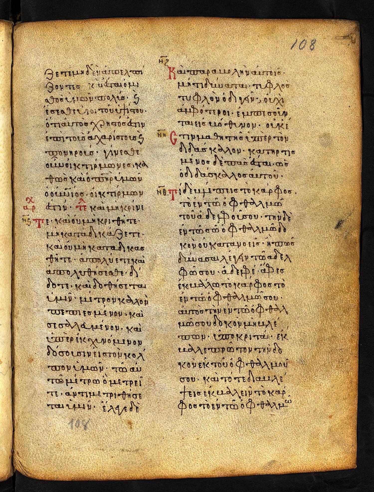 Thirteenth-century (c. 1200) manuscript of the Gospels on parchment; 197 leaves, 2 columns, 25 lines per column. These images are made available by the holding institution according to Creative Commons licensing. For recent digital images, visit Manuscriptorium online.