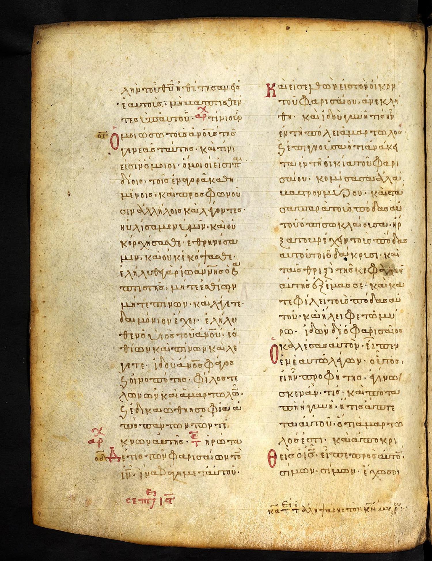 Thirteenth-century (c. 1200) manuscript of the Gospels on parchment; 197 leaves, 2 columns, 25 lines per column. These images are made available by the holding institution according to Creative Commons licensing. For recent digital images, visit Manuscriptorium online.