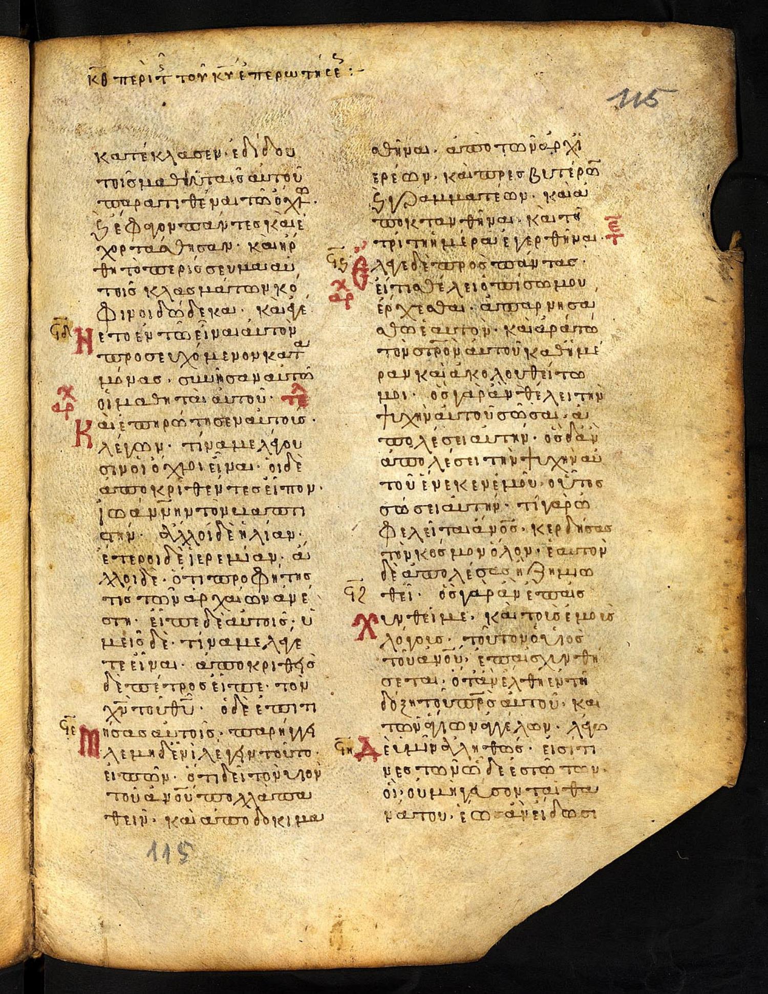 Thirteenth-century (c. 1200) manuscript of the Gospels on parchment; 197 leaves, 2 columns, 25 lines per column. These images are made available by the holding institution according to Creative Commons licensing. For recent digital images, visit Manuscriptorium online.