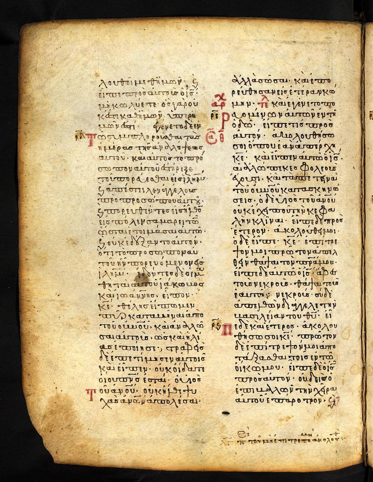 Thirteenth-century (c. 1200) manuscript of the Gospels on parchment; 197 leaves, 2 columns, 25 lines per column. These images are made available by the holding institution according to Creative Commons licensing. For recent digital images, visit Manuscriptorium online.