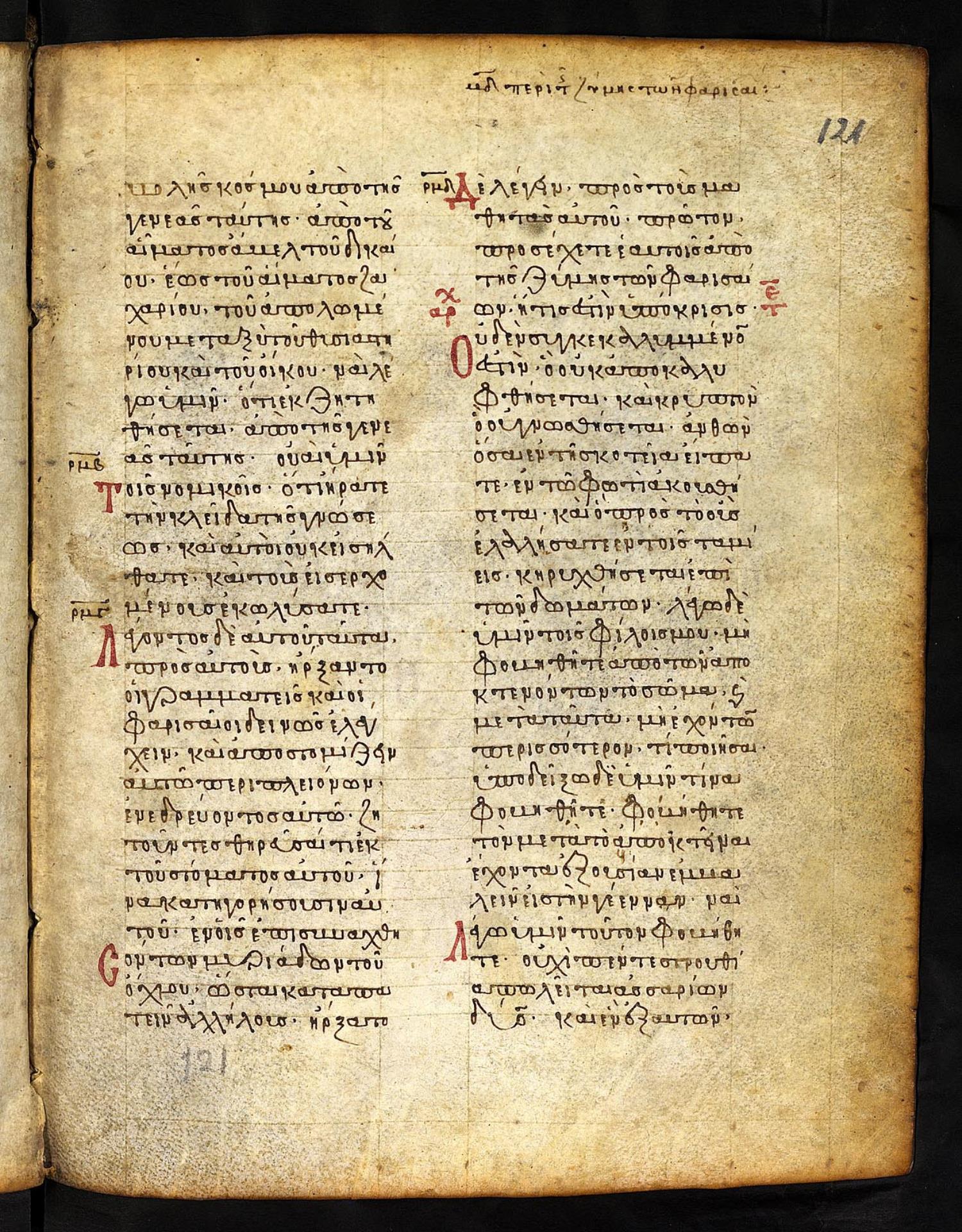 Thirteenth-century (c. 1200) manuscript of the Gospels on parchment; 197 leaves, 2 columns, 25 lines per column. These images are made available by the holding institution according to Creative Commons licensing. For recent digital images, visit Manuscriptorium online.