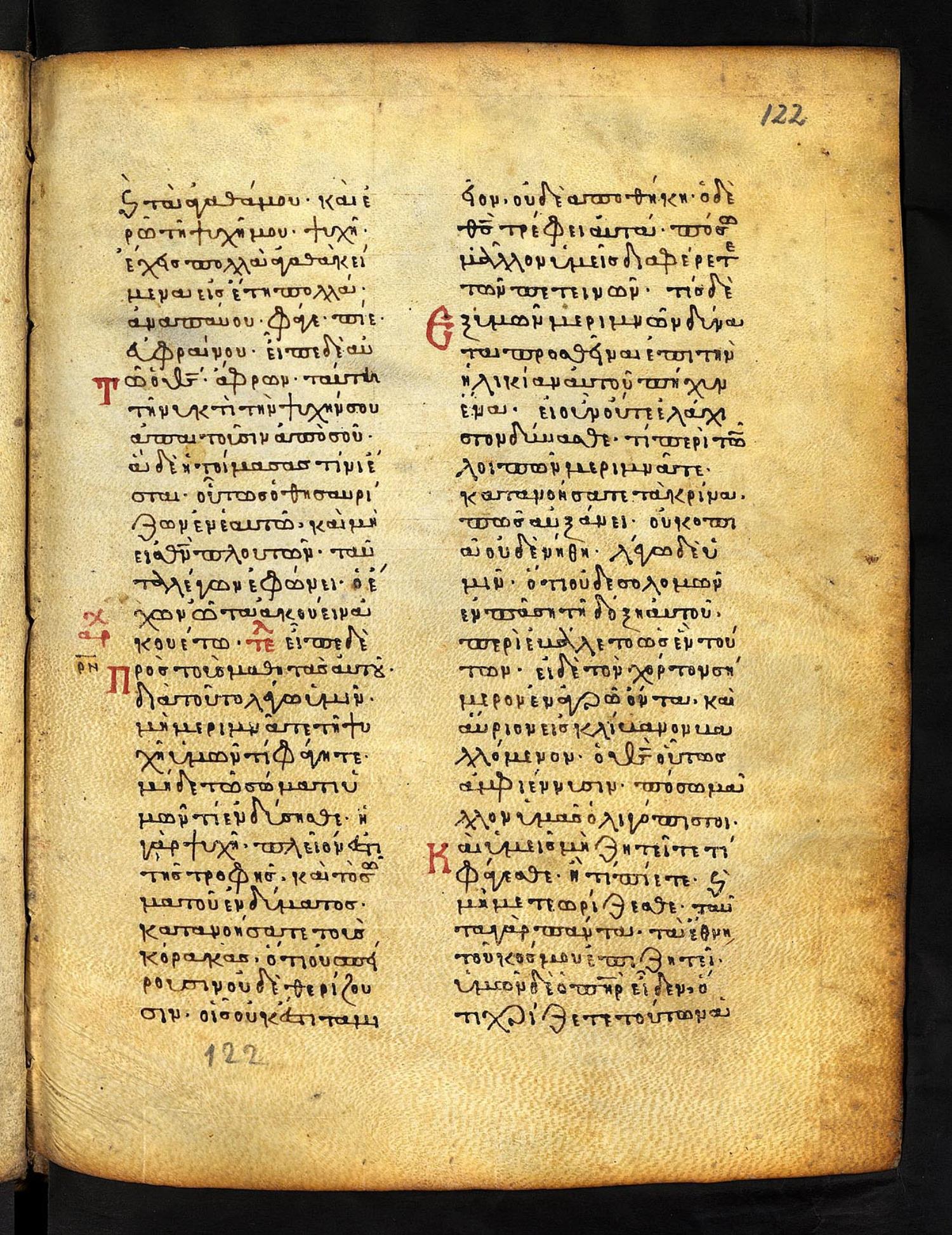 Thirteenth-century (c. 1200) manuscript of the Gospels on parchment; 197 leaves, 2 columns, 25 lines per column. These images are made available by the holding institution according to Creative Commons licensing. For recent digital images, visit Manuscriptorium online.