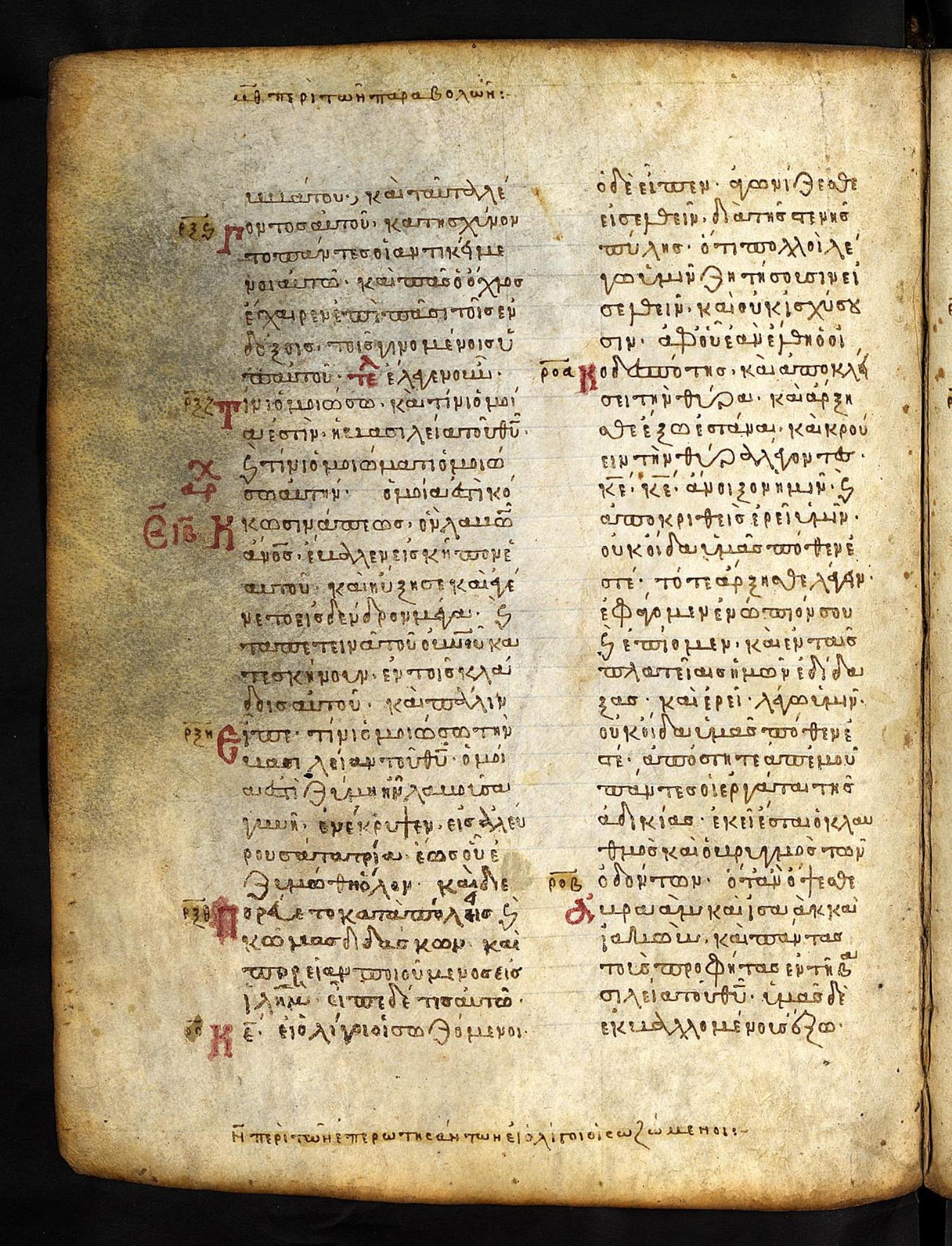 Thirteenth-century (c. 1200) manuscript of the Gospels on parchment; 197 leaves, 2 columns, 25 lines per column. These images are made available by the holding institution according to Creative Commons licensing. For recent digital images, visit Manuscriptorium online.