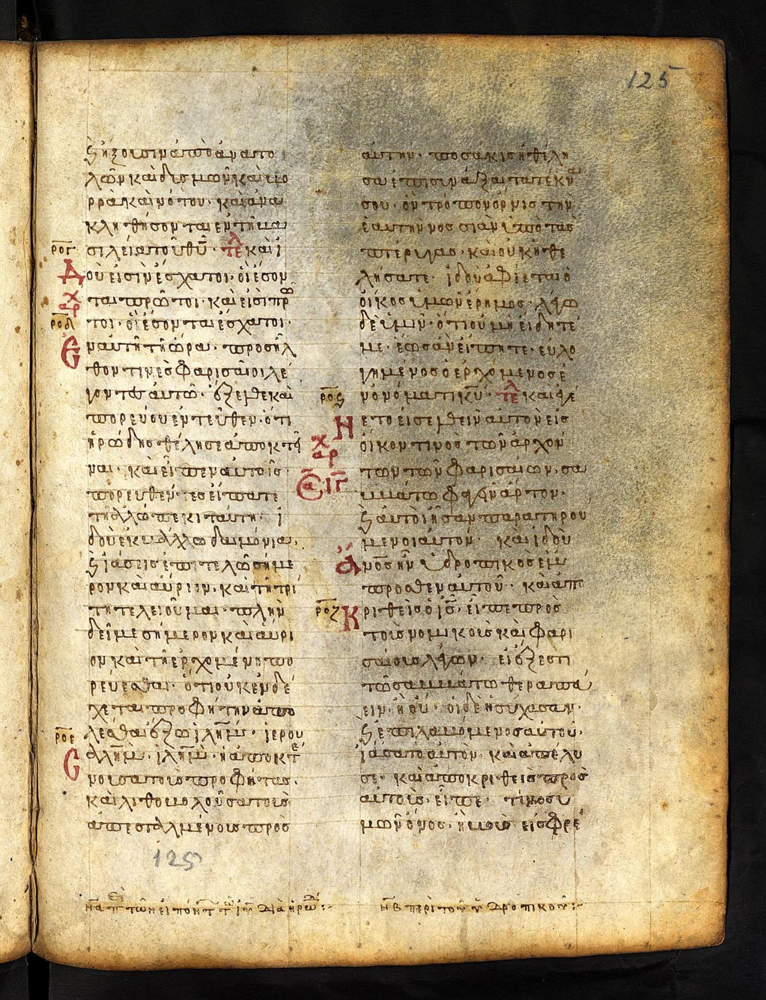 Thirteenth-century (c. 1200) manuscript of the Gospels on parchment; 197 leaves, 2 columns, 25 lines per column. These images are made available by the holding institution according to Creative Commons licensing. For recent digital images, visit Manuscriptorium online.