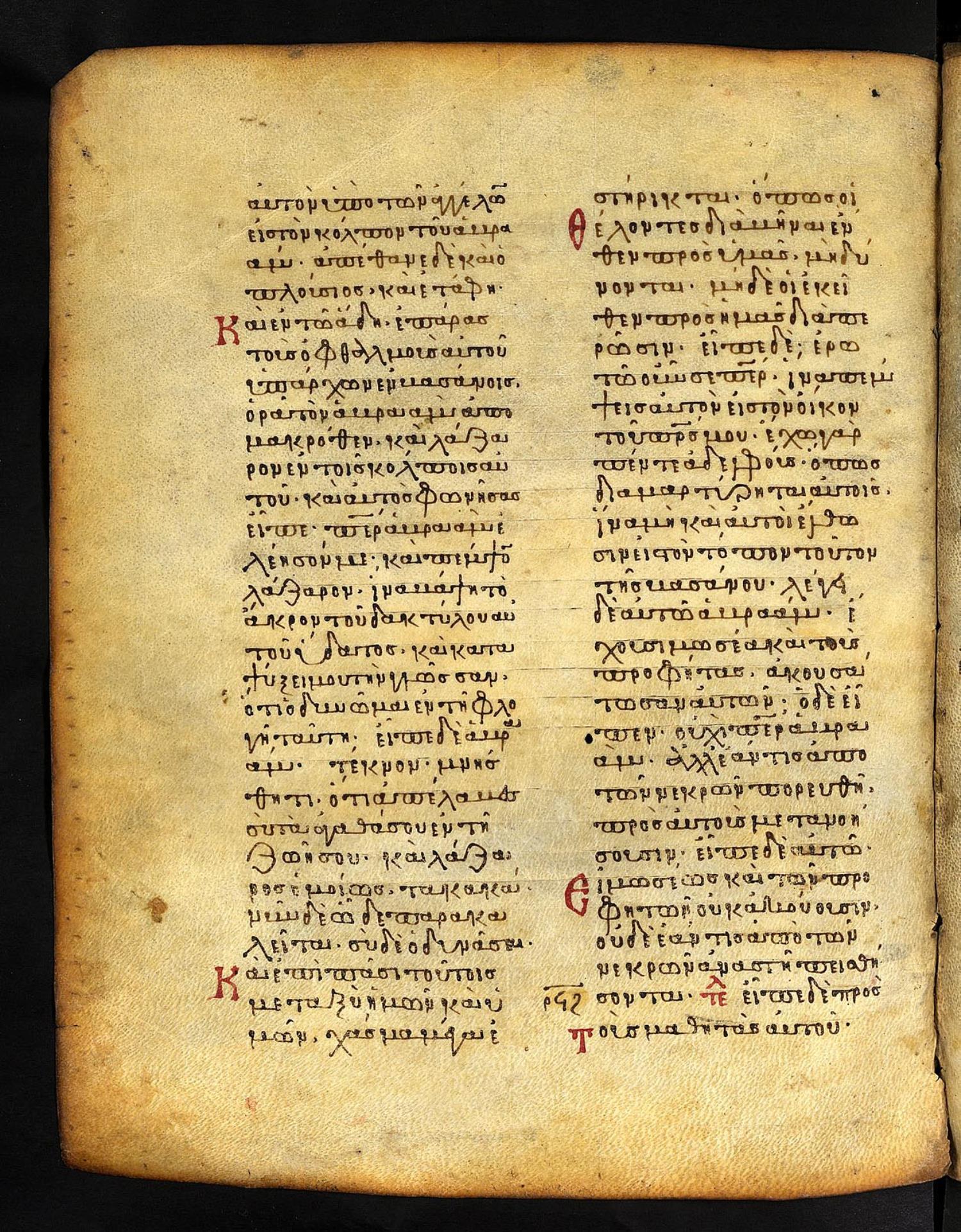 Thirteenth-century (c. 1200) manuscript of the Gospels on parchment; 197 leaves, 2 columns, 25 lines per column. These images are made available by the holding institution according to Creative Commons licensing. For recent digital images, visit Manuscriptorium online.