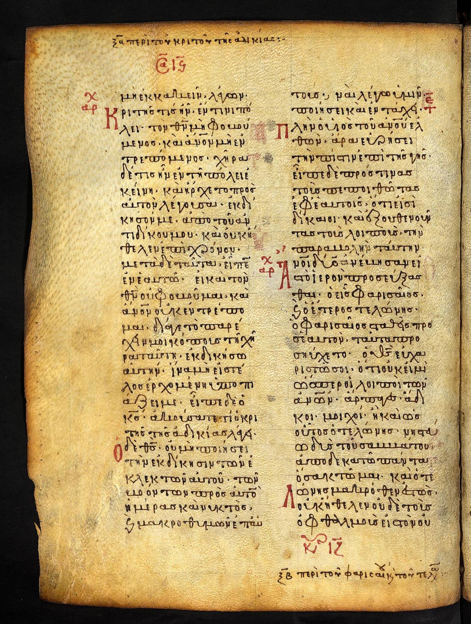 Thirteenth-century (c. 1200) manuscript of the Gospels on parchment; 197 leaves, 2 columns, 25 lines per column. These images are made available by the holding institution according to Creative Commons licensing. For recent digital images, visit Manuscriptorium online.