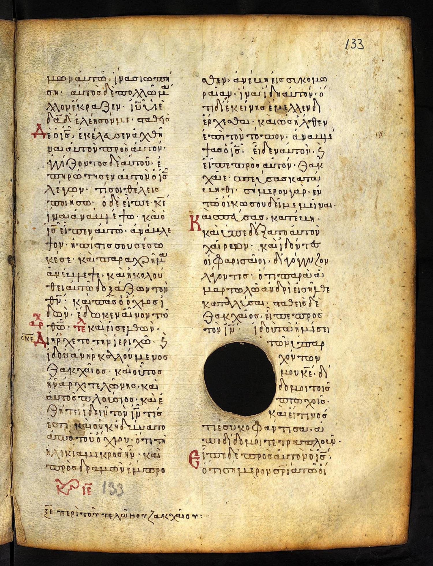 Thirteenth-century (c. 1200) manuscript of the Gospels on parchment; 197 leaves, 2 columns, 25 lines per column. These images are made available by the holding institution according to Creative Commons licensing. For recent digital images, visit Manuscriptorium online.