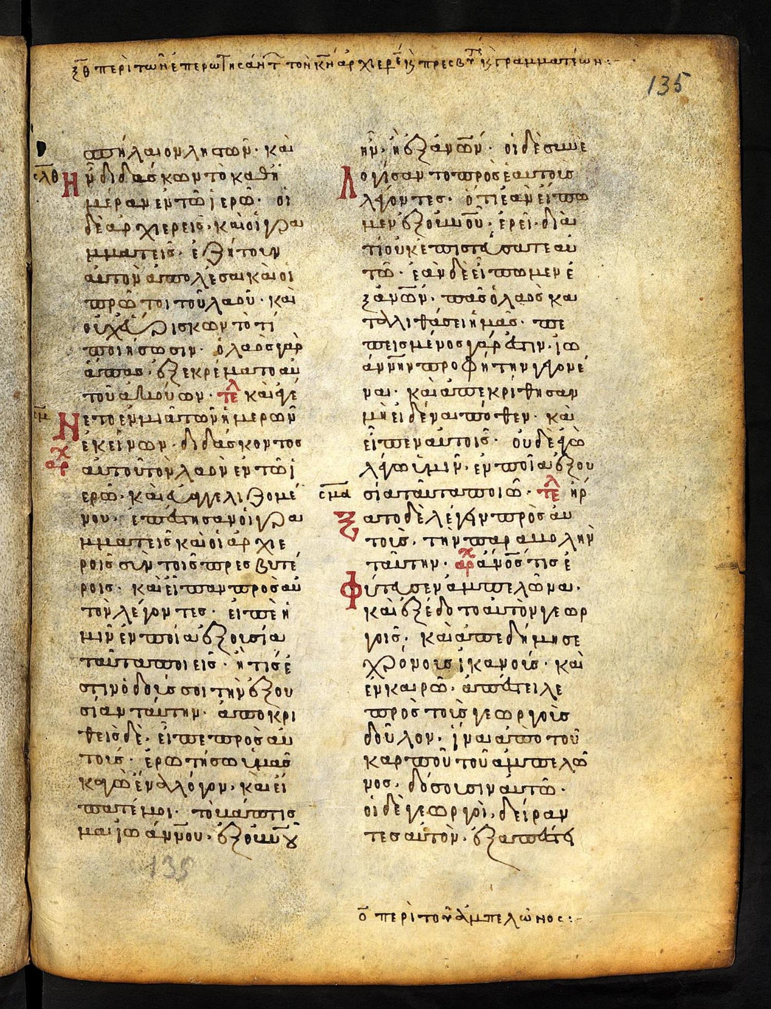 Thirteenth-century (c. 1200) manuscript of the Gospels on parchment; 197 leaves, 2 columns, 25 lines per column. These images are made available by the holding institution according to Creative Commons licensing. For recent digital images, visit Manuscriptorium online.