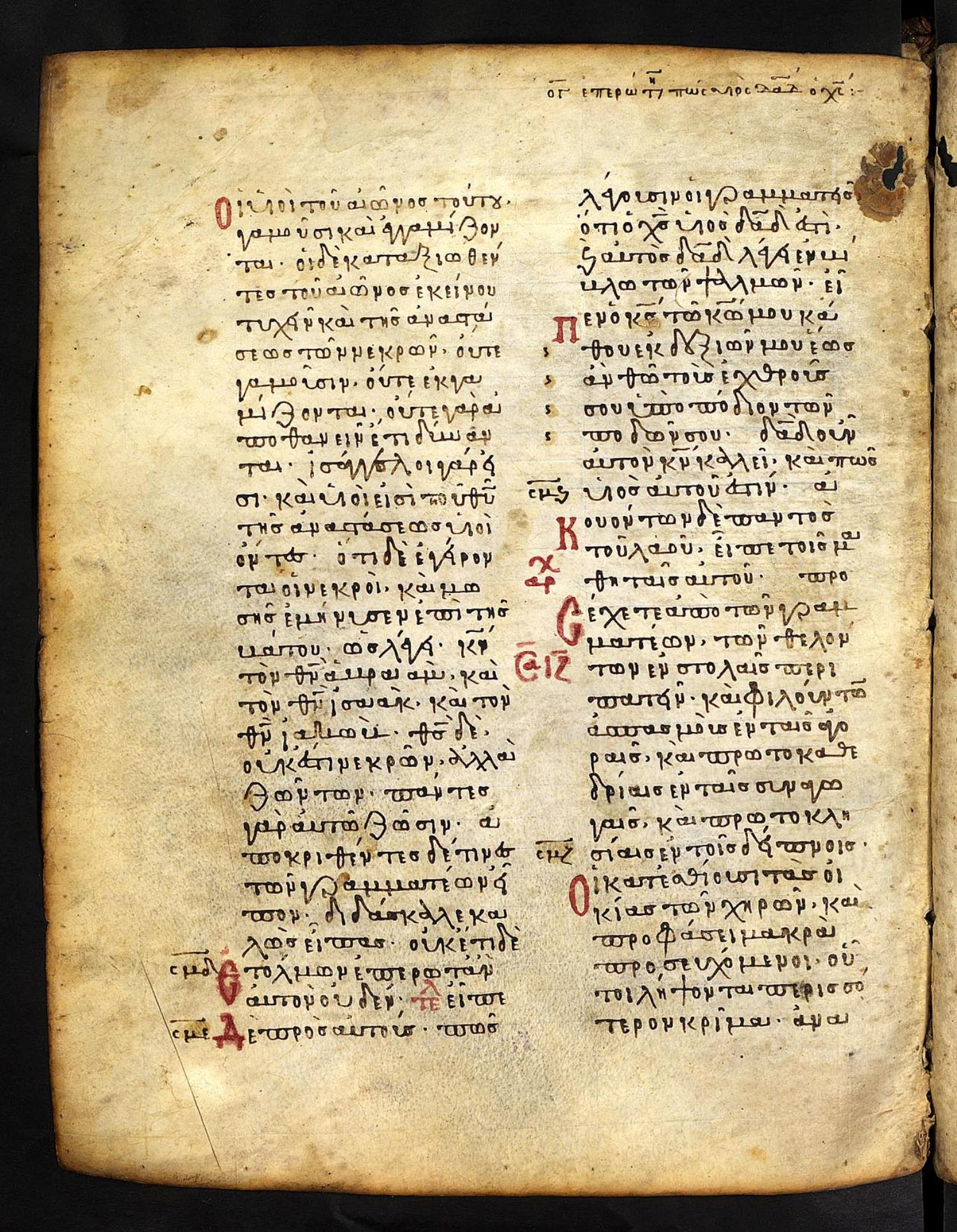 Thirteenth-century (c. 1200) manuscript of the Gospels on parchment; 197 leaves, 2 columns, 25 lines per column. These images are made available by the holding institution according to Creative Commons licensing. For recent digital images, visit Manuscriptorium online.