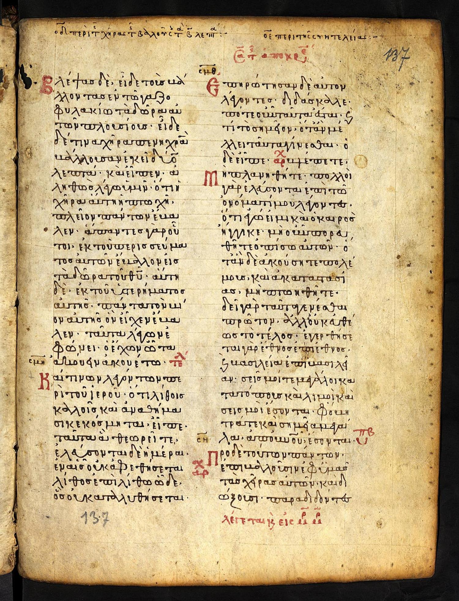 Thirteenth-century (c. 1200) manuscript of the Gospels on parchment; 197 leaves, 2 columns, 25 lines per column. These images are made available by the holding institution according to Creative Commons licensing. For recent digital images, visit Manuscriptorium online.