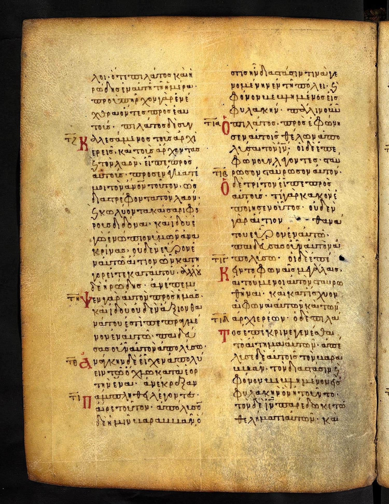 Thirteenth-century (c. 1200) manuscript of the Gospels on parchment; 197 leaves, 2 columns, 25 lines per column. These images are made available by the holding institution according to Creative Commons licensing. For recent digital images, visit Manuscriptorium online.