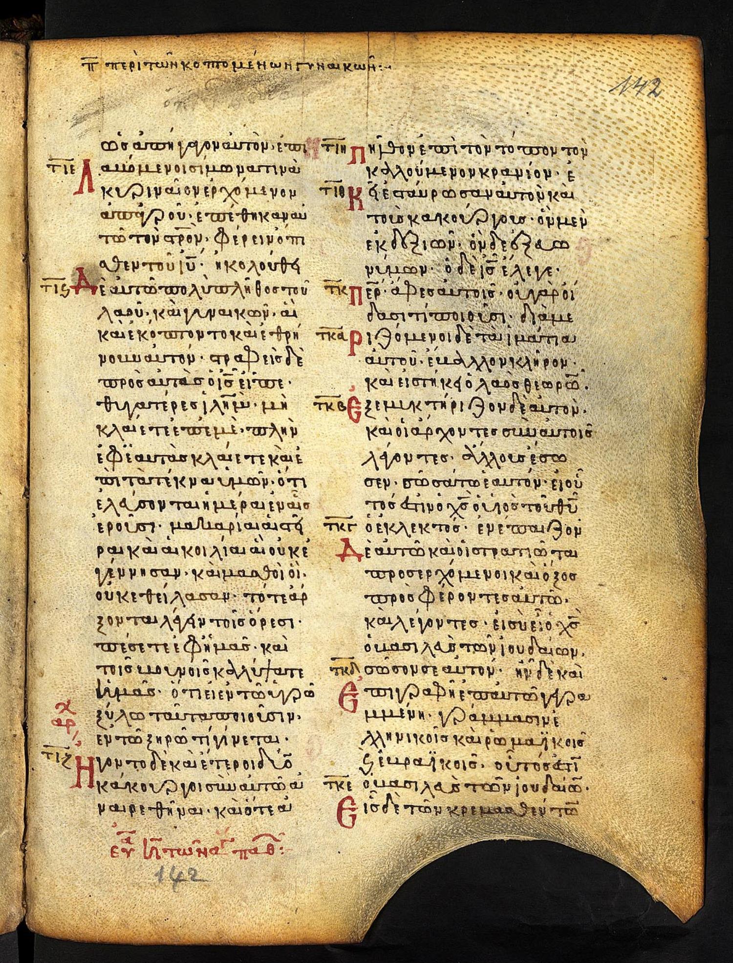 Thirteenth-century (c. 1200) manuscript of the Gospels on parchment; 197 leaves, 2 columns, 25 lines per column. These images are made available by the holding institution according to Creative Commons licensing. For recent digital images, visit Manuscriptorium online.