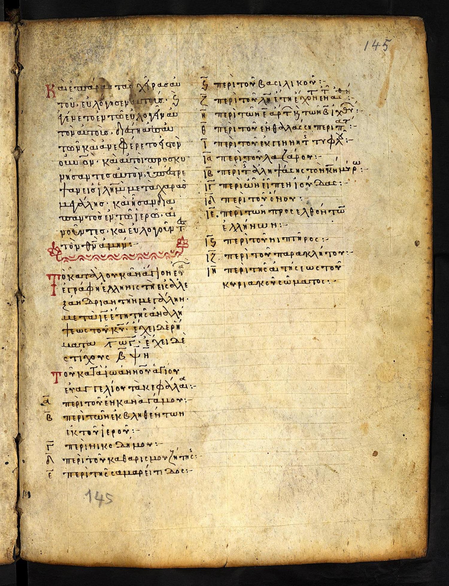Thirteenth-century (c. 1200) manuscript of the Gospels on parchment; 197 leaves, 2 columns, 25 lines per column. These images are made available by the holding institution according to Creative Commons licensing. For recent digital images, visit Manuscriptorium online.