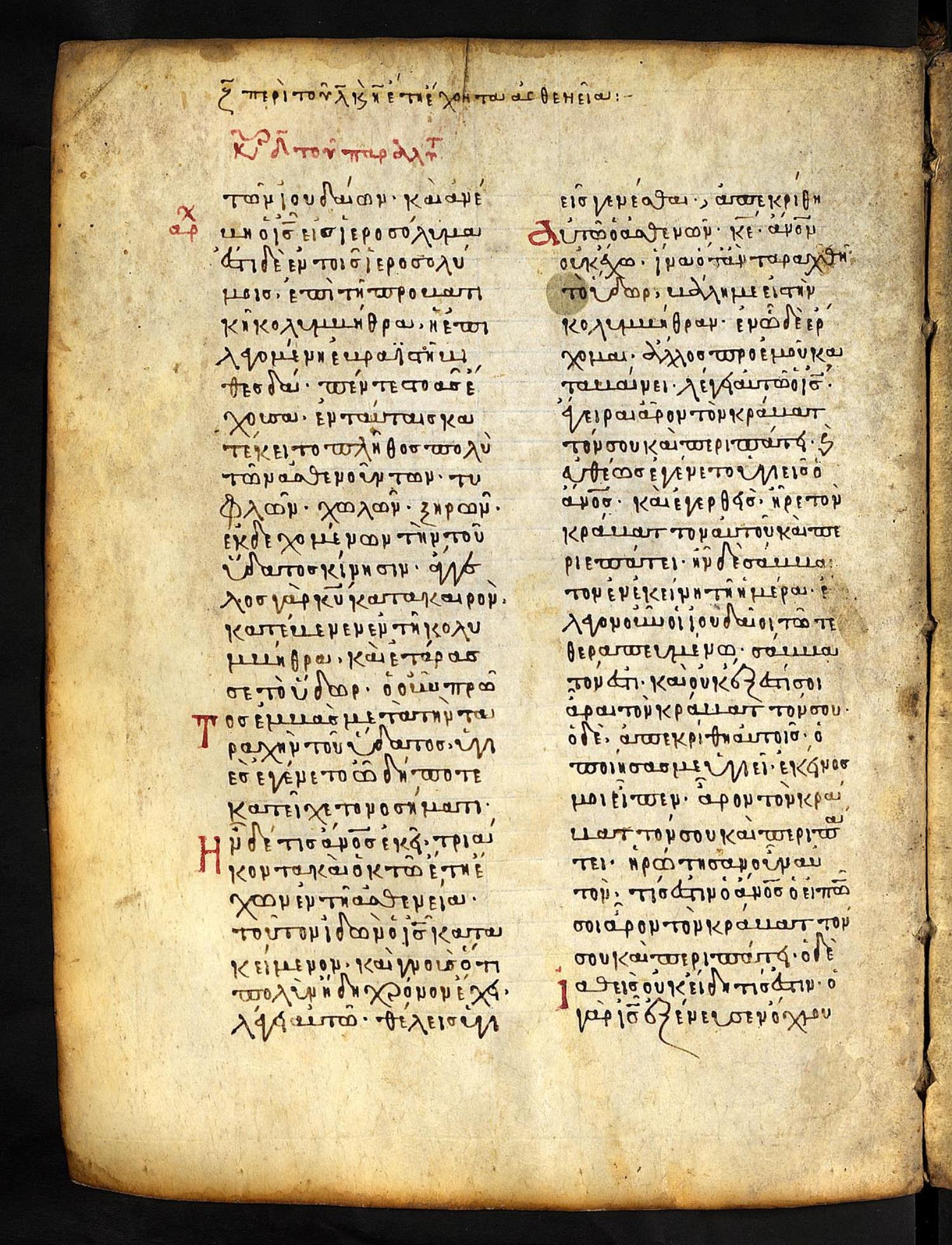 Thirteenth-century (c. 1200) manuscript of the Gospels on parchment; 197 leaves, 2 columns, 25 lines per column. These images are made available by the holding institution according to Creative Commons licensing. For recent digital images, visit Manuscriptorium online.