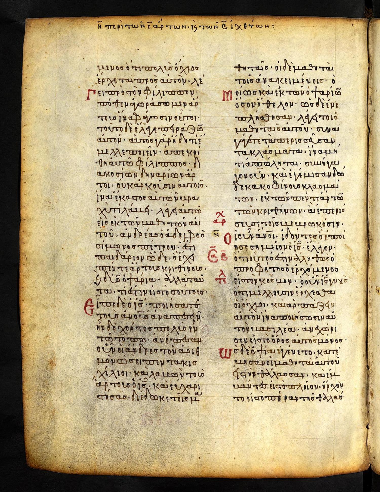 Thirteenth-century (c. 1200) manuscript of the Gospels on parchment; 197 leaves, 2 columns, 25 lines per column. These images are made available by the holding institution according to Creative Commons licensing. For recent digital images, visit Manuscriptorium online.