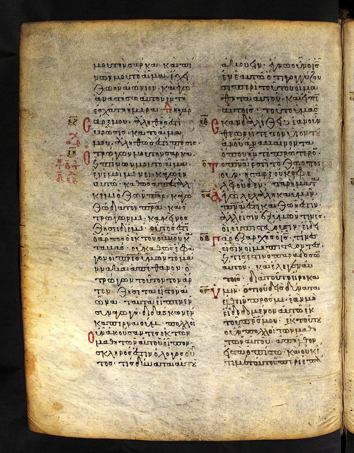 Thirteenth-century (c. 1200) manuscript of the Gospels on parchment; 197 leaves, 2 columns, 25 lines per column. These images are made available by the holding institution according to Creative Commons licensing. For recent digital images, visit Manuscriptorium online.