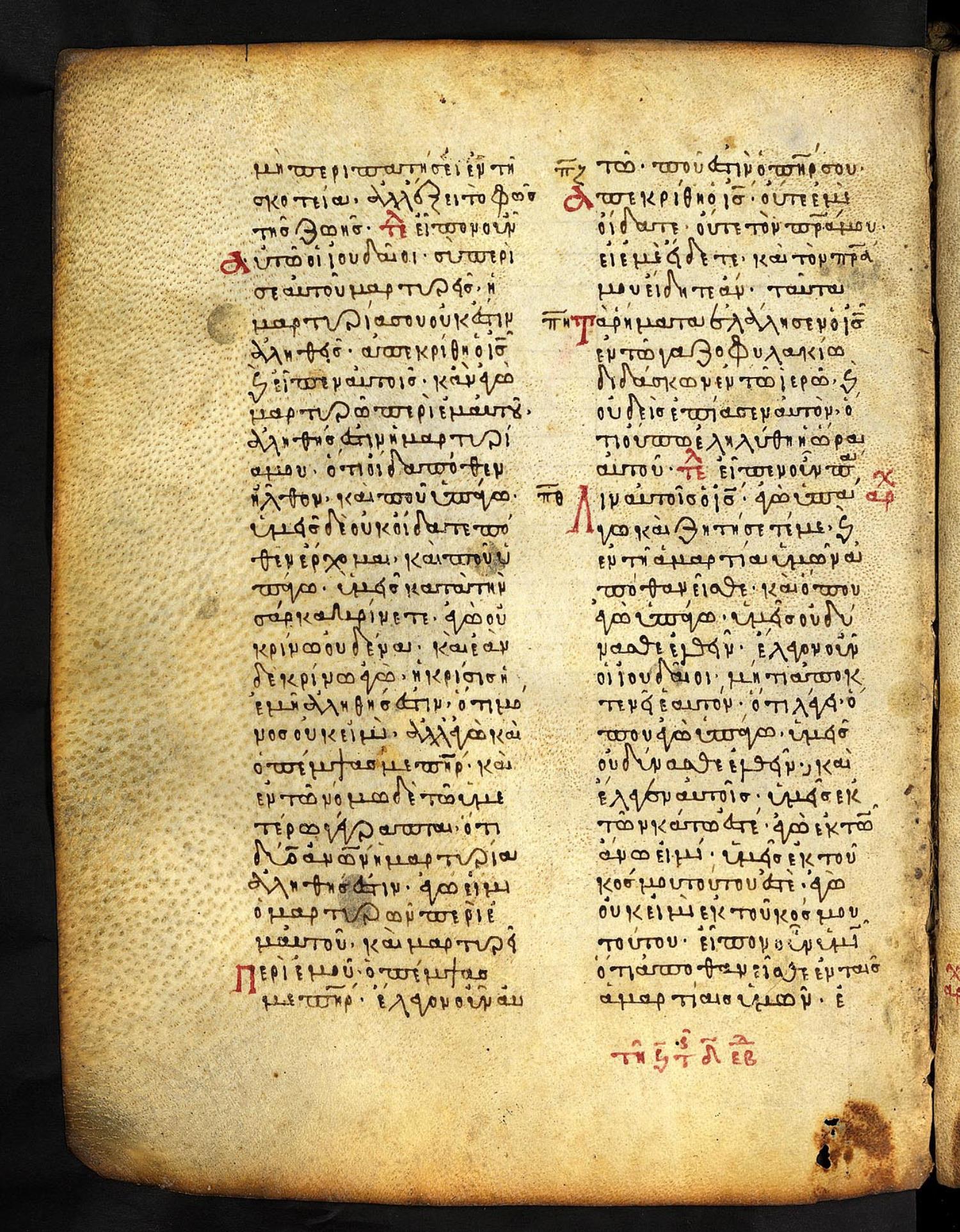 Thirteenth-century (c. 1200) manuscript of the Gospels on parchment; 197 leaves, 2 columns, 25 lines per column. These images are made available by the holding institution according to Creative Commons licensing. For recent digital images, visit Manuscriptorium online.