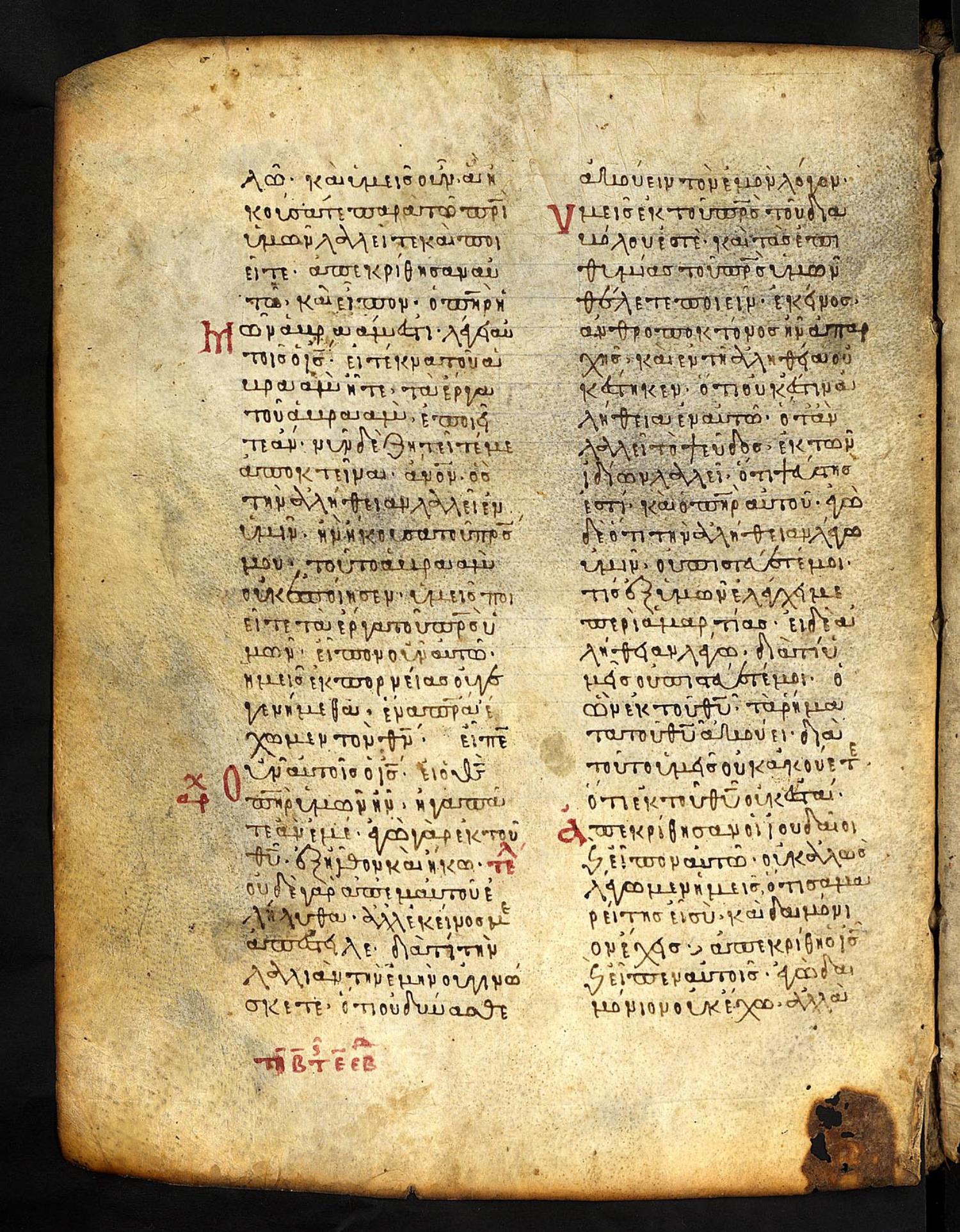 Thirteenth-century (c. 1200) manuscript of the Gospels on parchment; 197 leaves, 2 columns, 25 lines per column. These images are made available by the holding institution according to Creative Commons licensing. For recent digital images, visit Manuscriptorium online.