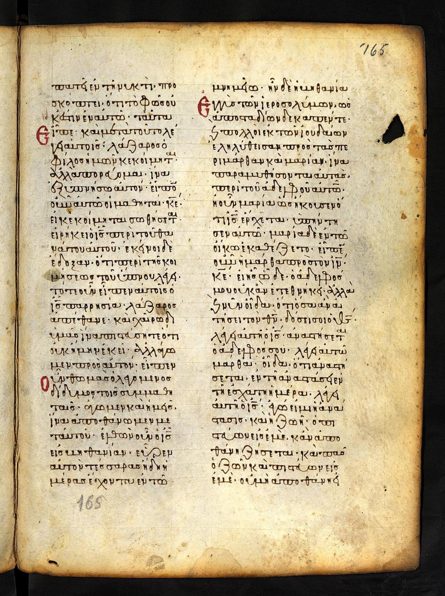 Thirteenth-century (c. 1200) manuscript of the Gospels on parchment; 197 leaves, 2 columns, 25 lines per column. These images are made available by the holding institution according to Creative Commons licensing. For recent digital images, visit Manuscriptorium online.