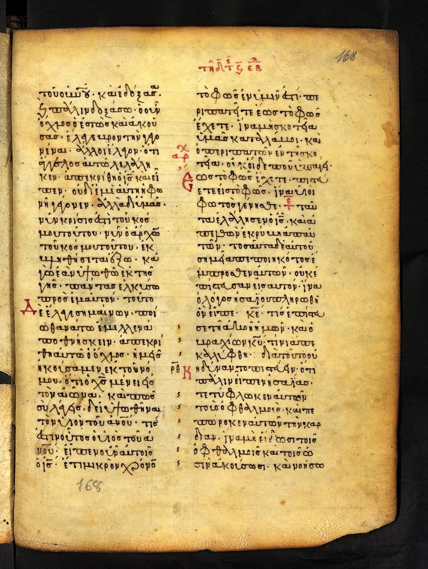 Thirteenth-century (c. 1200) manuscript of the Gospels on parchment; 197 leaves, 2 columns, 25 lines per column. These images are made available by the holding institution according to Creative Commons licensing. For recent digital images, visit Manuscriptorium online.