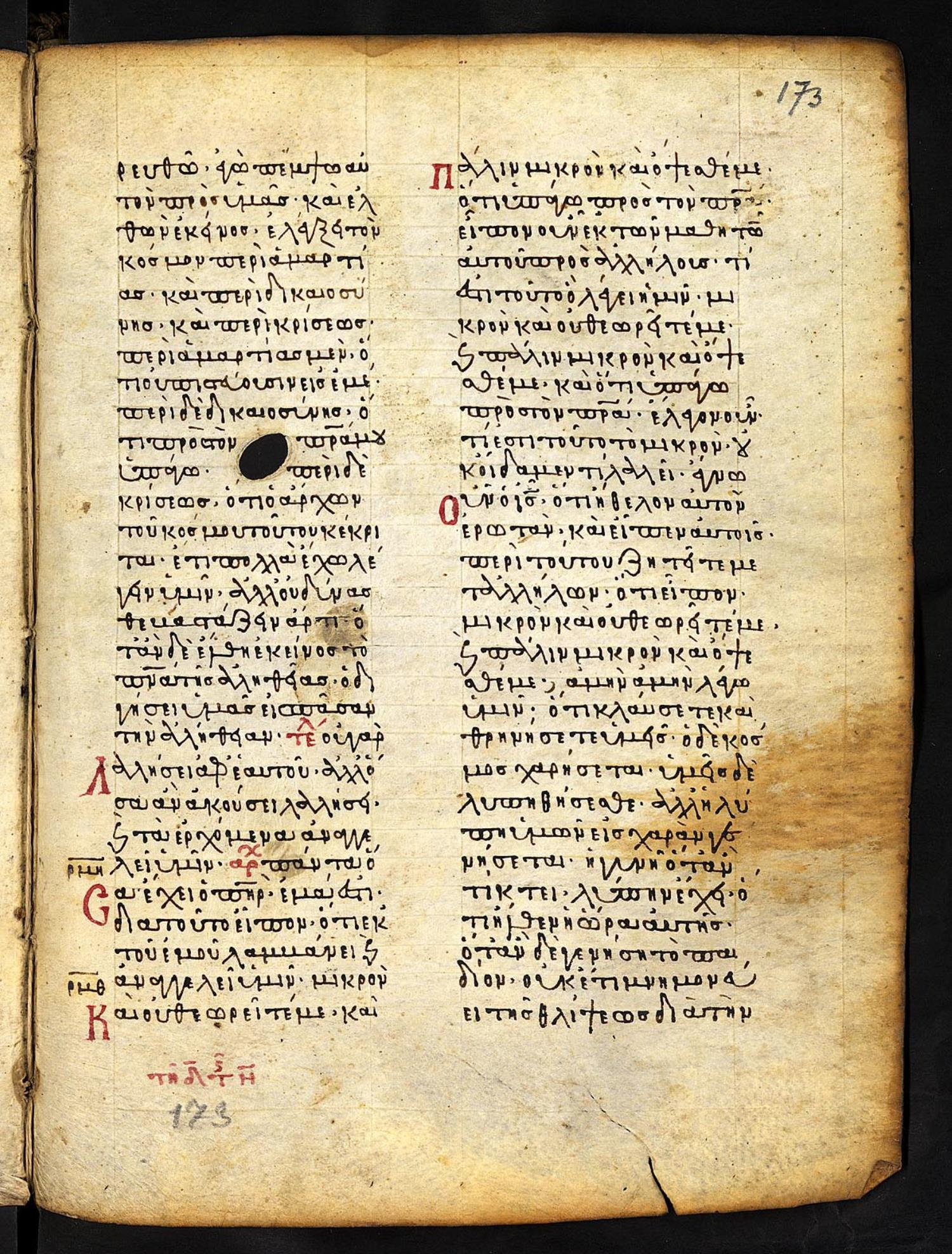 Thirteenth-century (c. 1200) manuscript of the Gospels on parchment; 197 leaves, 2 columns, 25 lines per column. These images are made available by the holding institution according to Creative Commons licensing. For recent digital images, visit Manuscriptorium online.