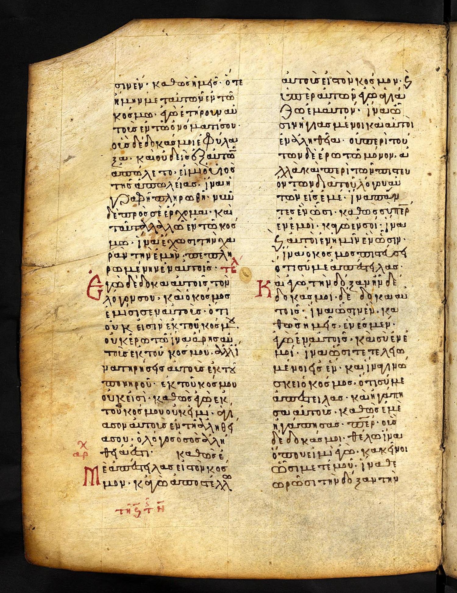 Thirteenth-century (c. 1200) manuscript of the Gospels on parchment; 197 leaves, 2 columns, 25 lines per column. These images are made available by the holding institution according to Creative Commons licensing. For recent digital images, visit Manuscriptorium online.