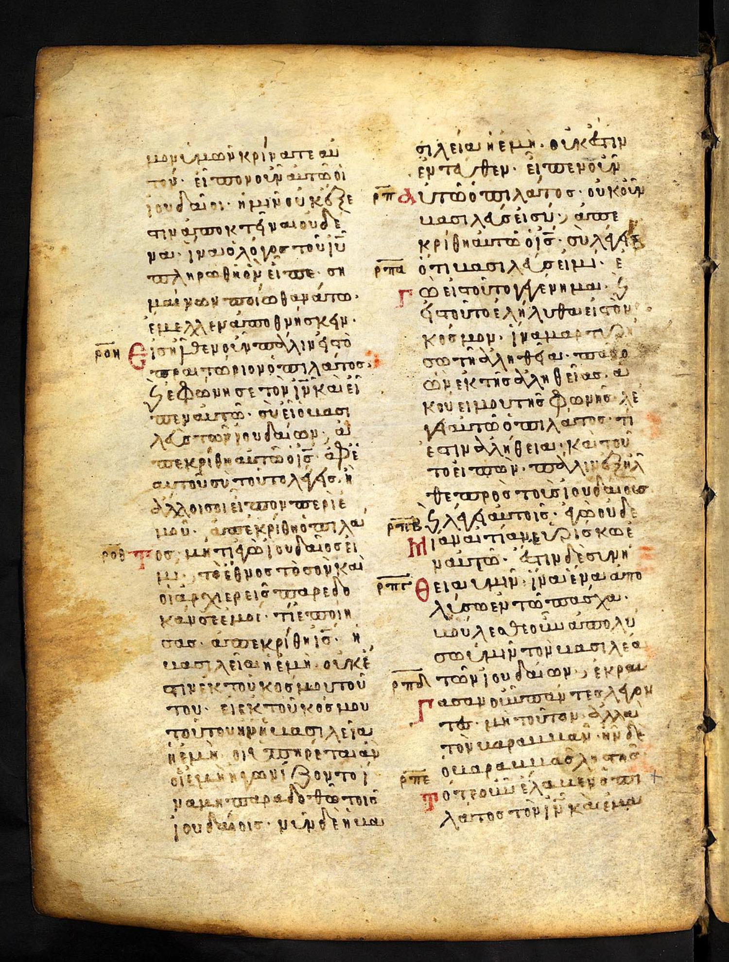 Thirteenth-century (c. 1200) manuscript of the Gospels on parchment; 197 leaves, 2 columns, 25 lines per column. These images are made available by the holding institution according to Creative Commons licensing. For recent digital images, visit Manuscriptorium online.