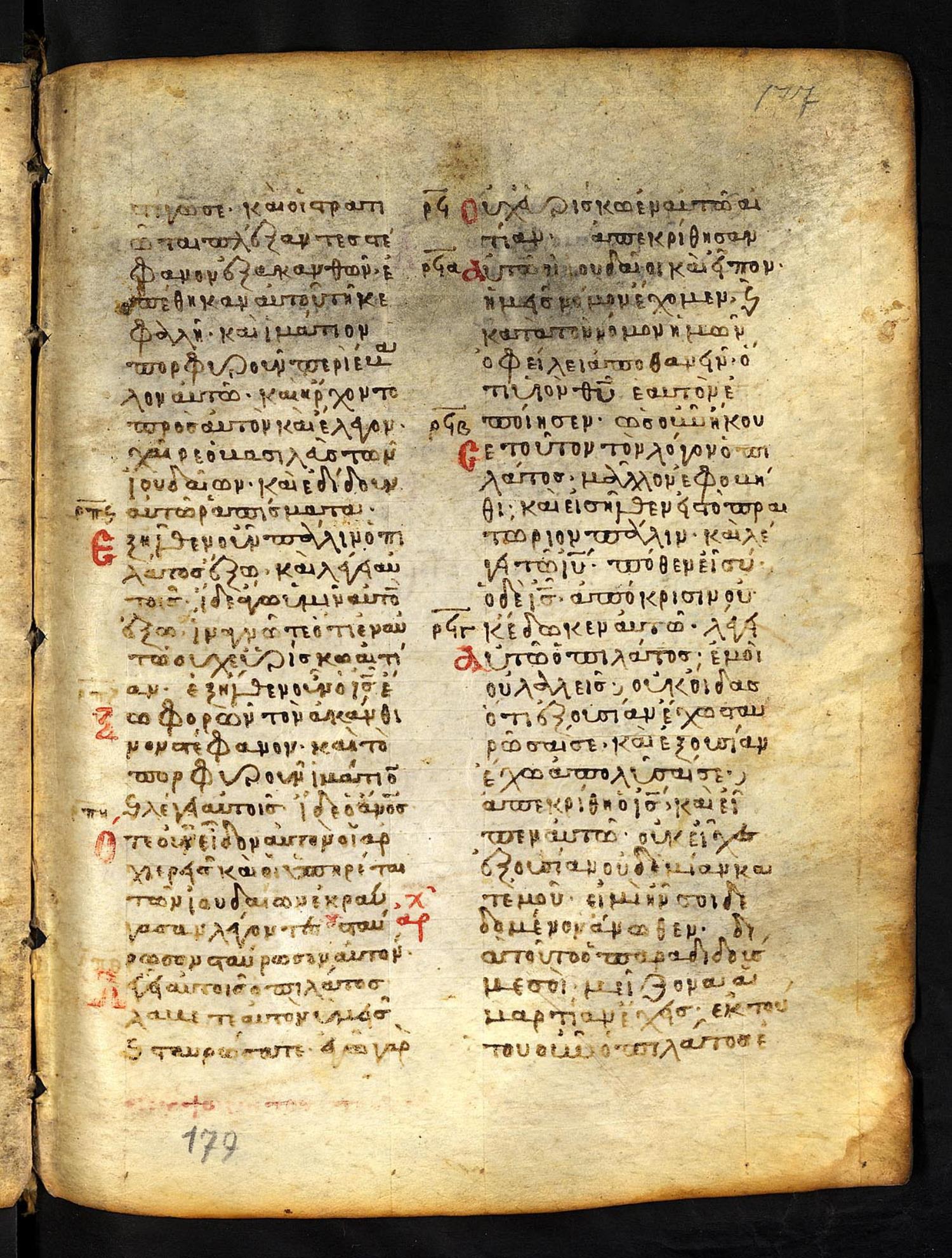Thirteenth-century (c. 1200) manuscript of the Gospels on parchment; 197 leaves, 2 columns, 25 lines per column. These images are made available by the holding institution according to Creative Commons licensing. For recent digital images, visit Manuscriptorium online.