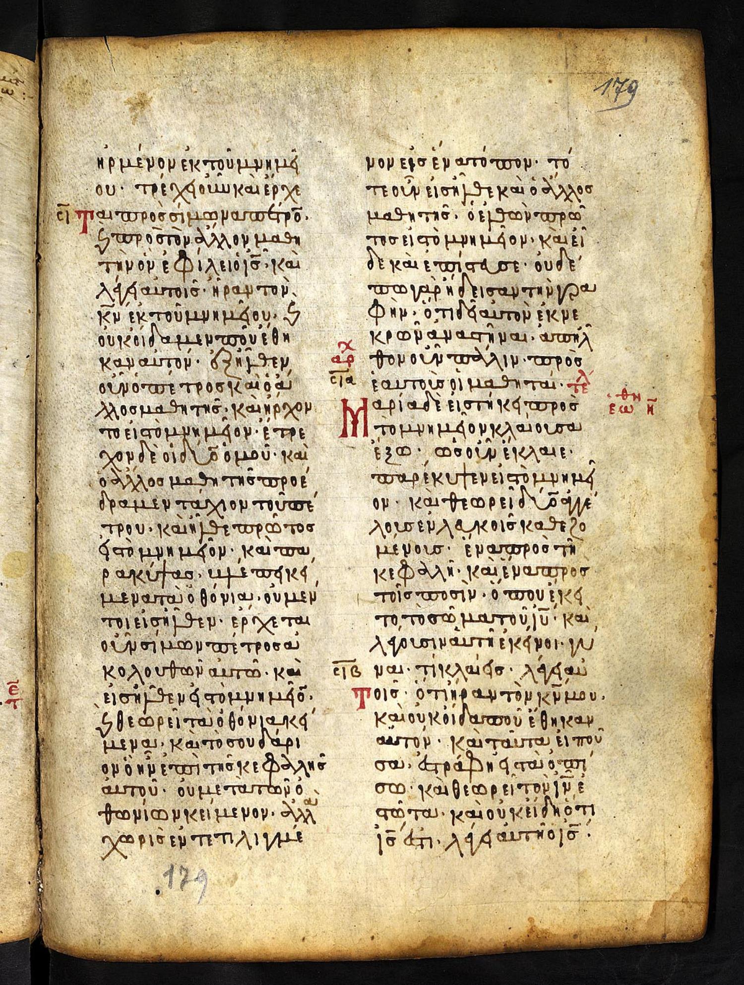 Thirteenth-century (c. 1200) manuscript of the Gospels on parchment; 197 leaves, 2 columns, 25 lines per column. These images are made available by the holding institution according to Creative Commons licensing. For recent digital images, visit Manuscriptorium online.