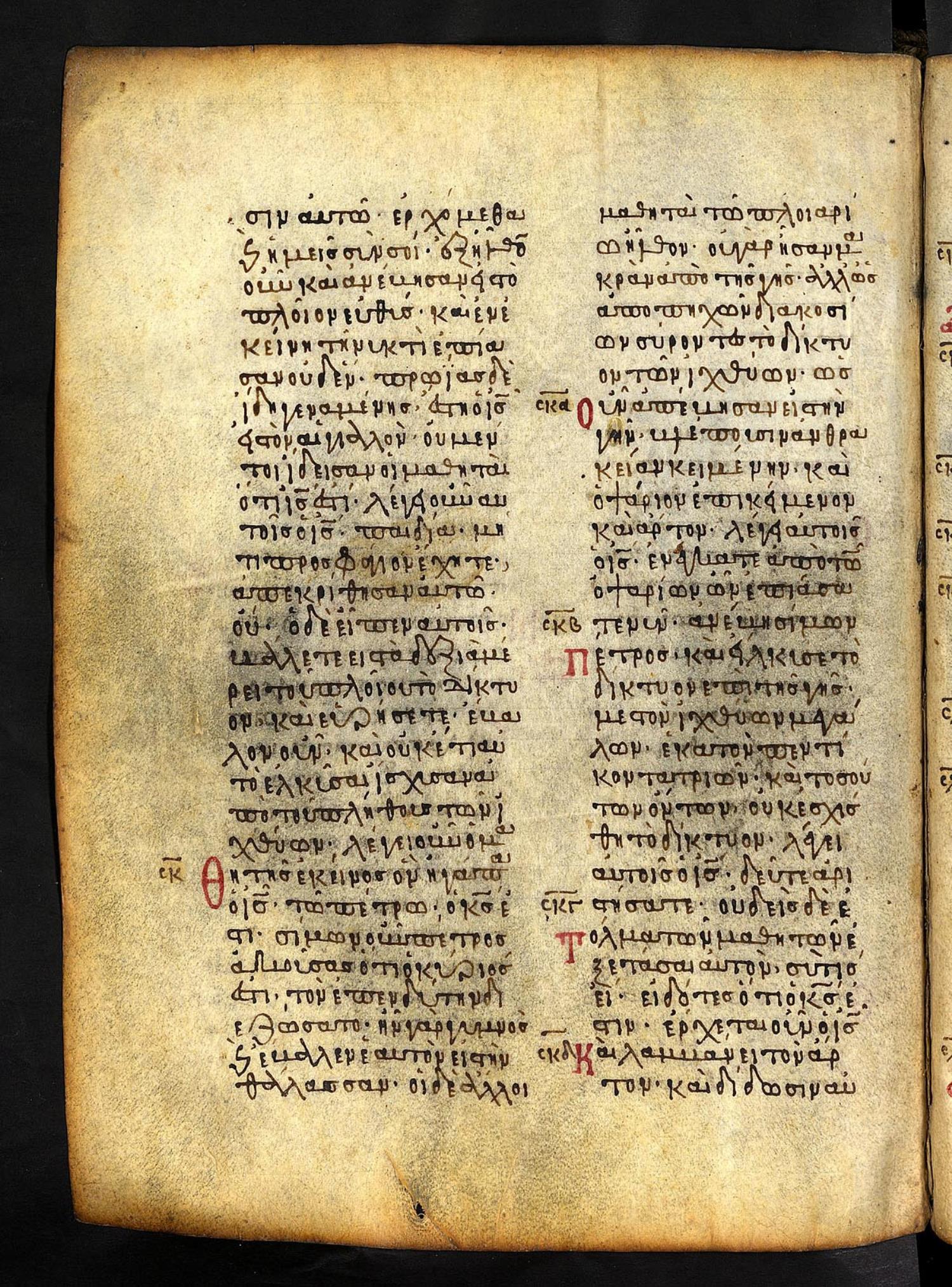 Thirteenth-century (c. 1200) manuscript of the Gospels on parchment; 197 leaves, 2 columns, 25 lines per column. These images are made available by the holding institution according to Creative Commons licensing. For recent digital images, visit Manuscriptorium online.
