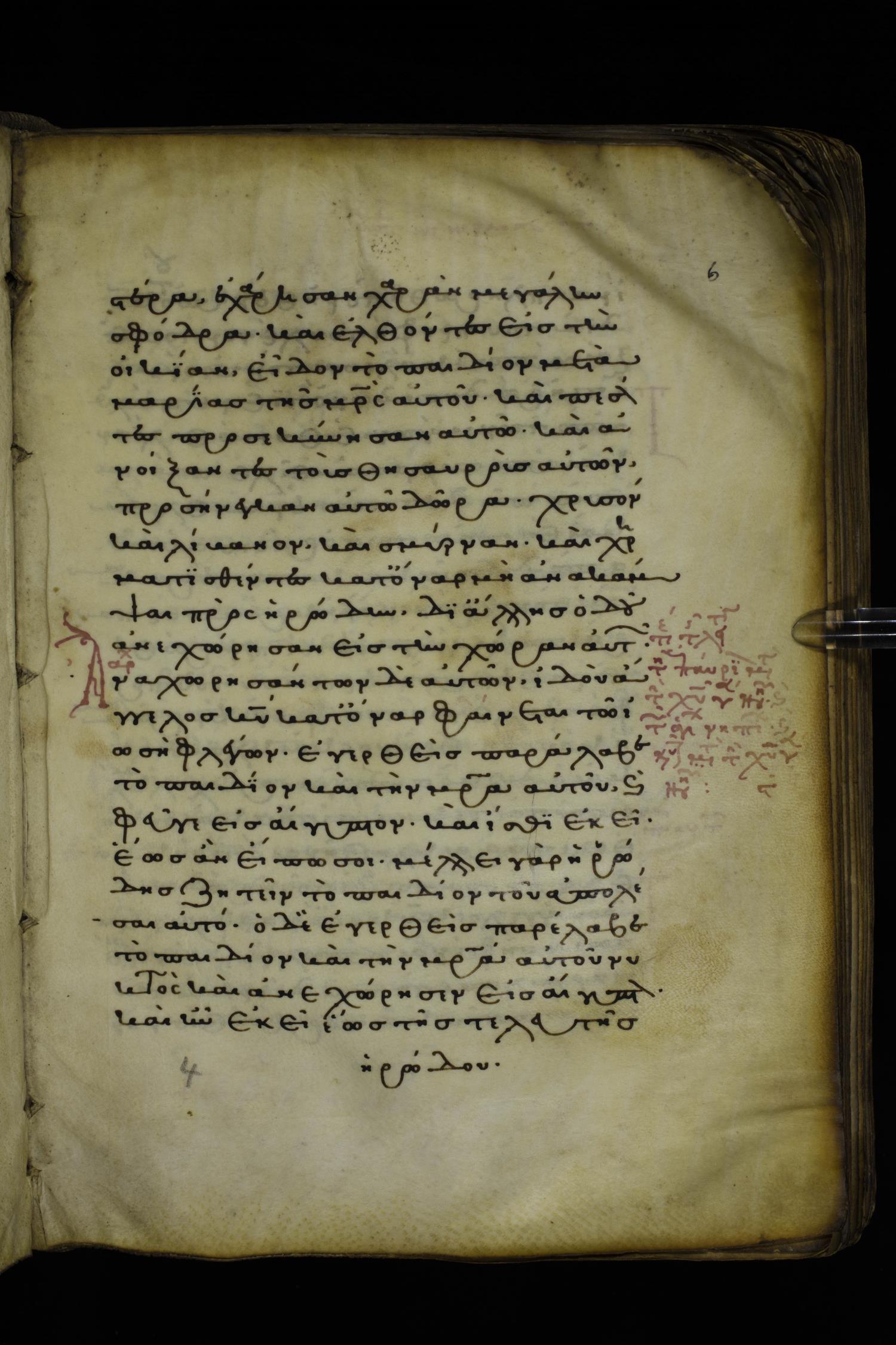 Thirteenth or fourteenth century minuscule of the Gospels on parchment; 312 leaves, 1 column, 19-22 lines per column. Images were taken at the National Library of Greece in Athens.