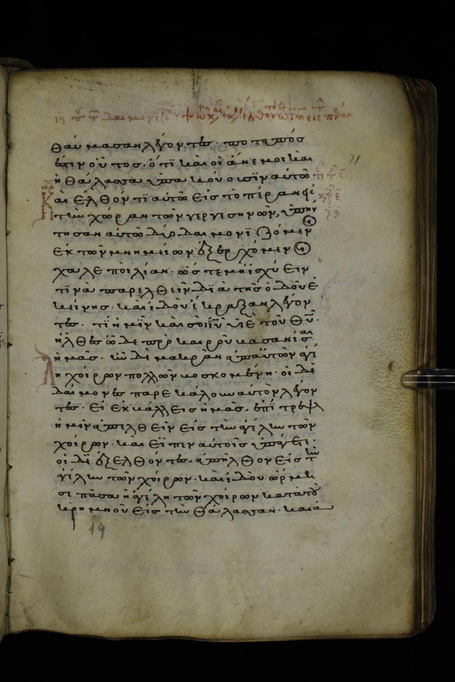 Thirteenth or fourteenth century minuscule of the Gospels on parchment; 312 leaves, 1 column, 19-22 lines per column. Images were taken at the National Library of Greece in Athens.