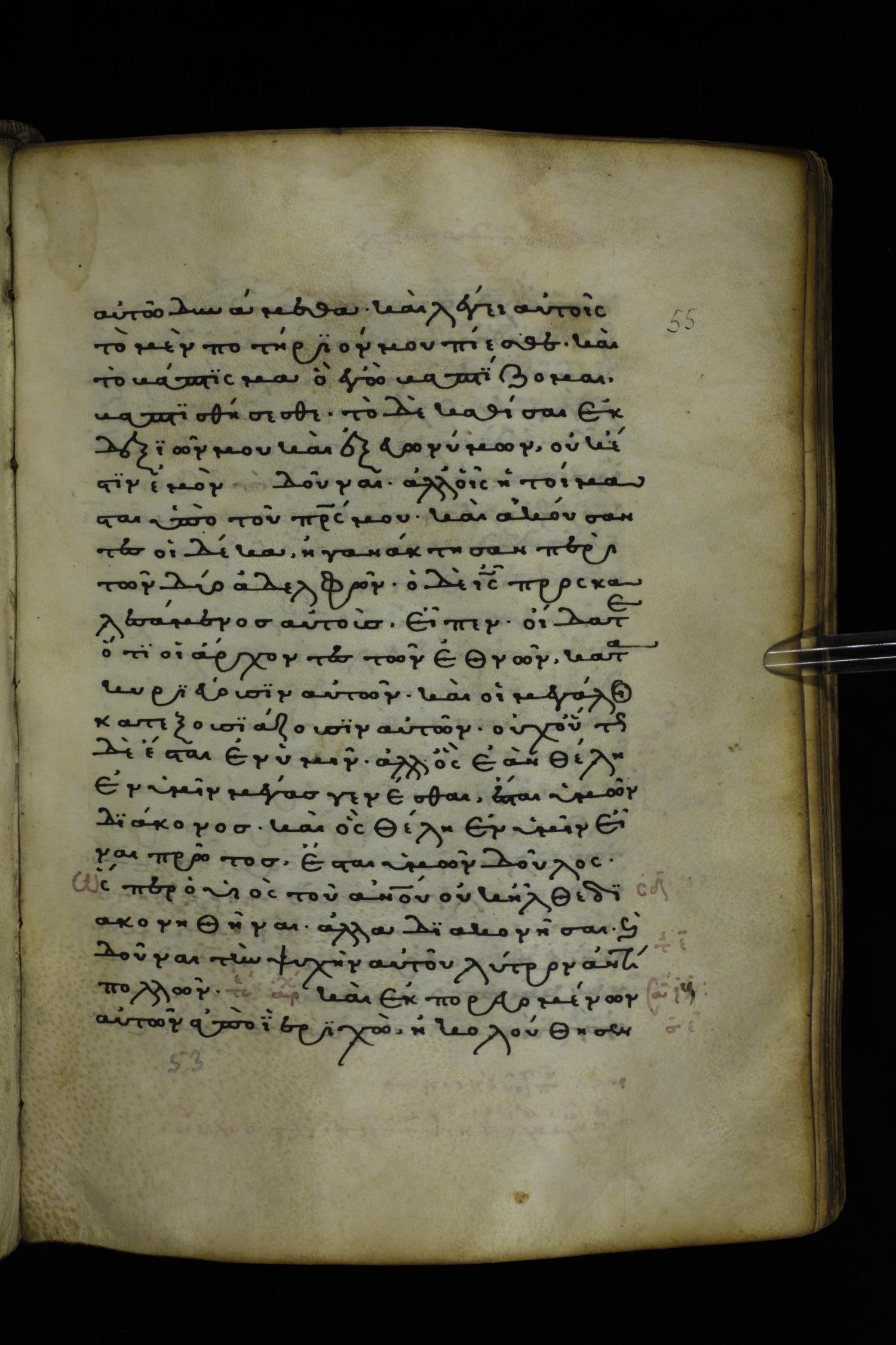 Thirteenth or fourteenth century minuscule of the Gospels on parchment; 312 leaves, 1 column, 19-22 lines per column. Images were taken at the National Library of Greece in Athens.