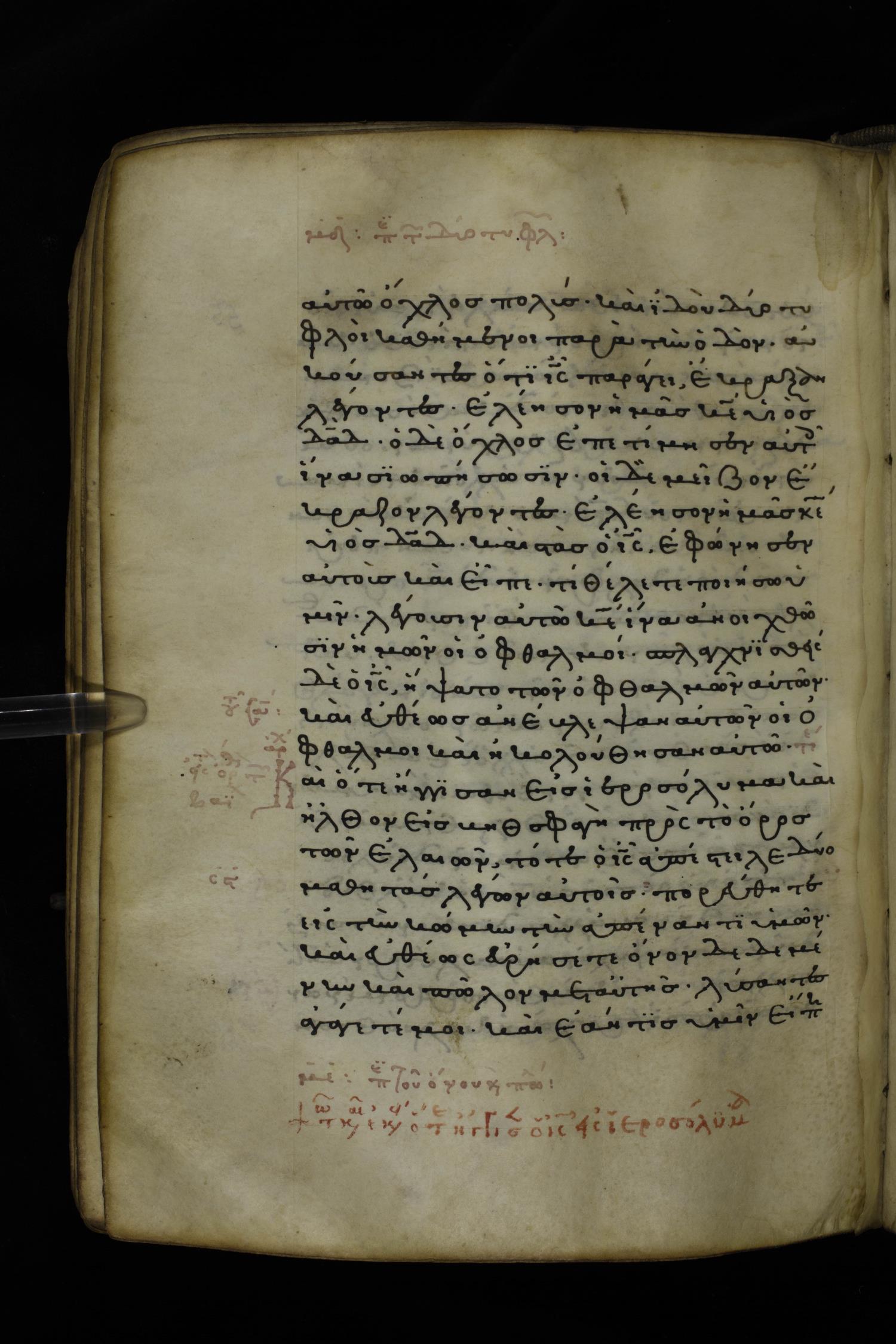 Thirteenth or fourteenth century minuscule of the Gospels on parchment; 312 leaves, 1 column, 19-22 lines per column. Images were taken at the National Library of Greece in Athens.