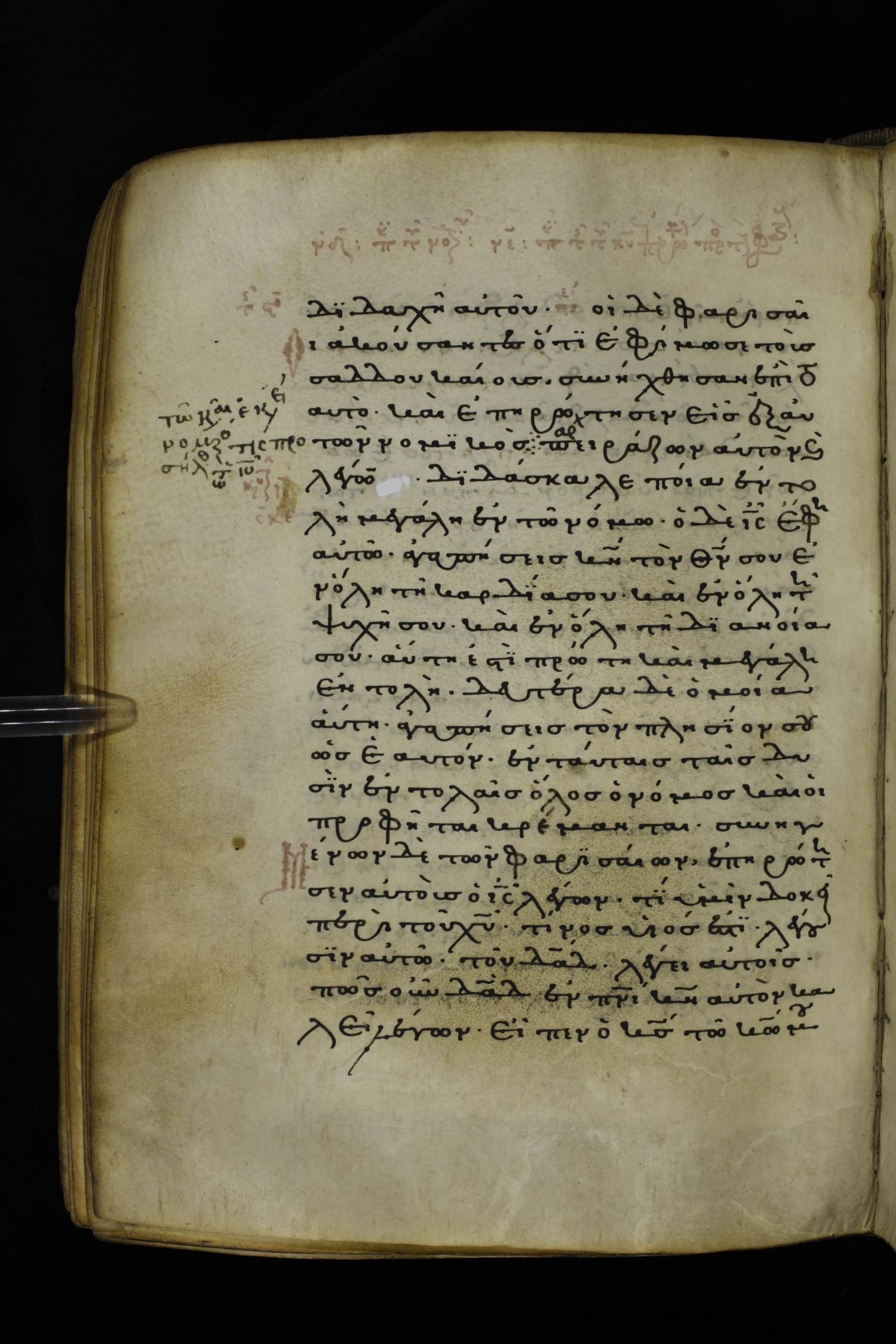 Thirteenth or fourteenth century minuscule of the Gospels on parchment; 312 leaves, 1 column, 19-22 lines per column. Images were taken at the National Library of Greece in Athens.