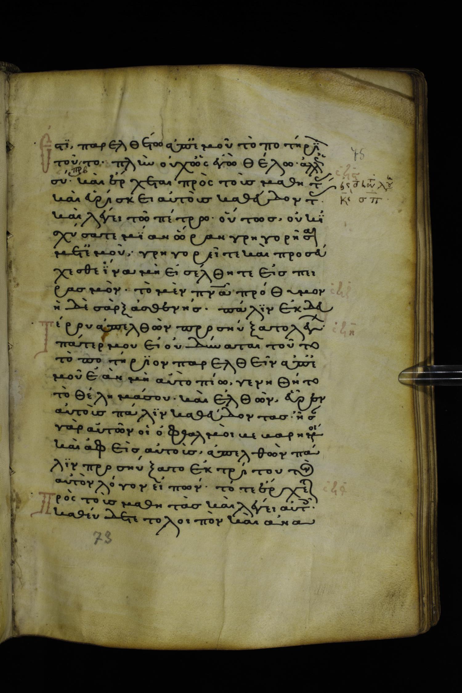 Thirteenth or fourteenth century minuscule of the Gospels on parchment; 312 leaves, 1 column, 19-22 lines per column. Images were taken at the National Library of Greece in Athens.