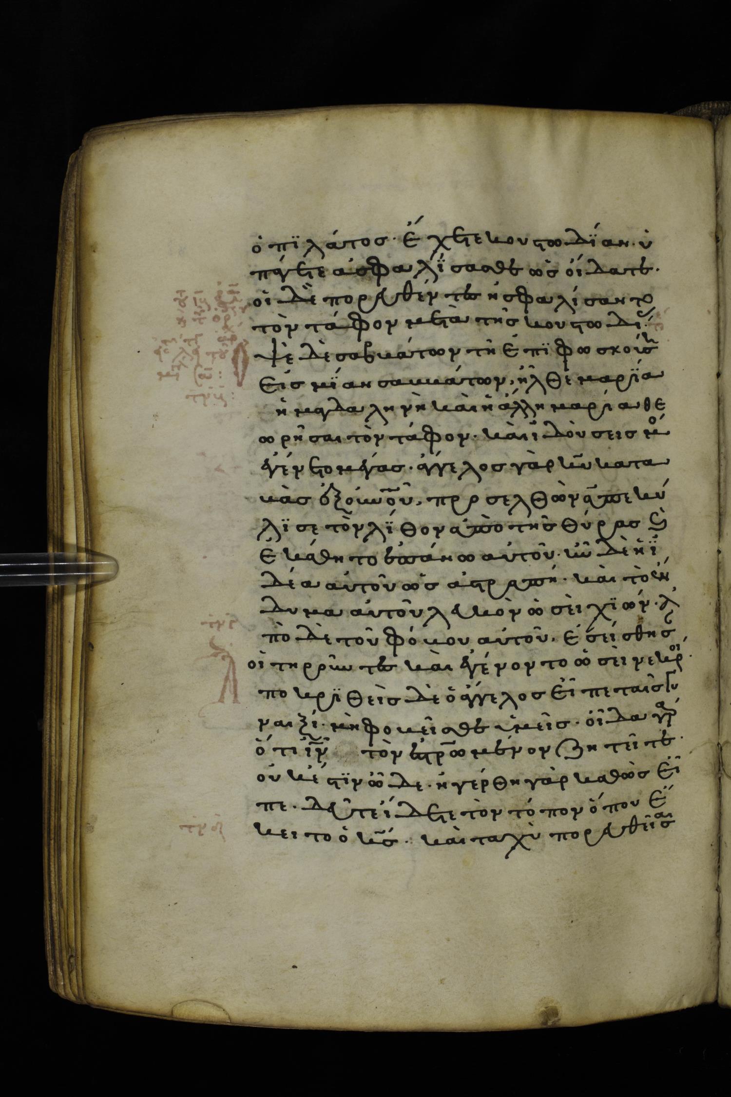 Thirteenth or fourteenth century minuscule of the Gospels on parchment; 312 leaves, 1 column, 19-22 lines per column. Images were taken at the National Library of Greece in Athens.