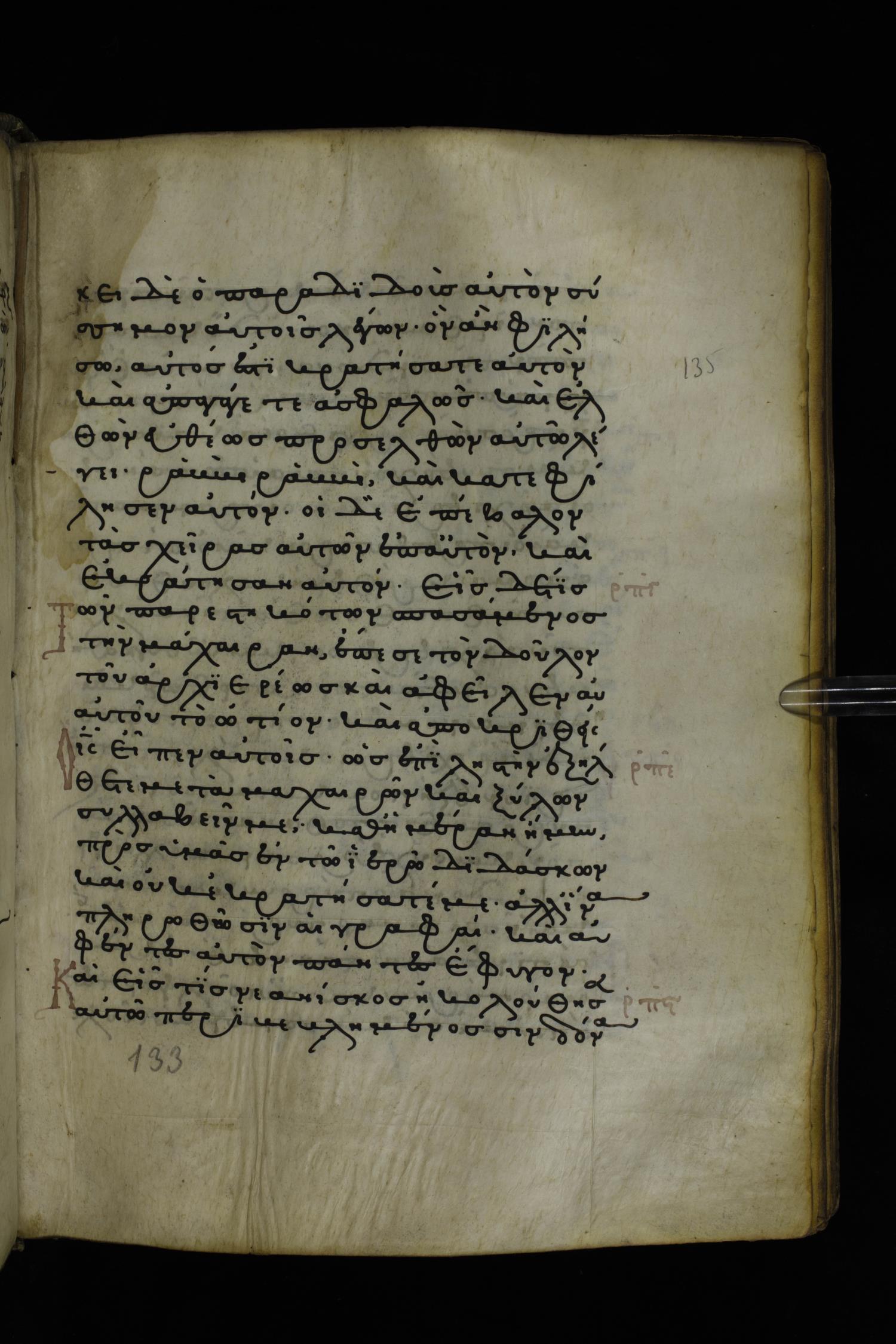 Thirteenth or fourteenth century minuscule of the Gospels on parchment; 312 leaves, 1 column, 19-22 lines per column. Images were taken at the National Library of Greece in Athens.