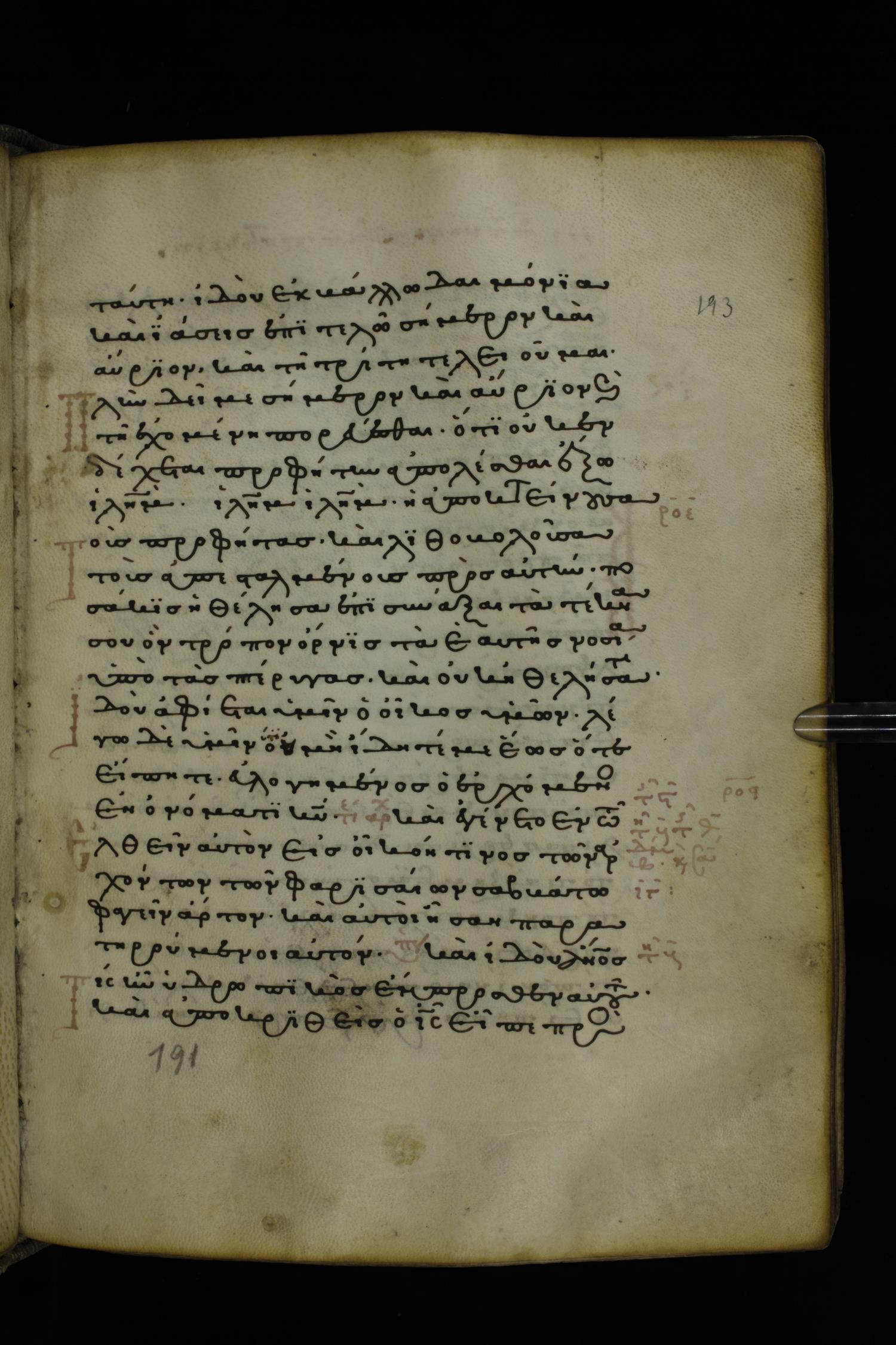 Thirteenth or fourteenth century minuscule of the Gospels on parchment; 312 leaves, 1 column, 19-22 lines per column. Images were taken at the National Library of Greece in Athens.