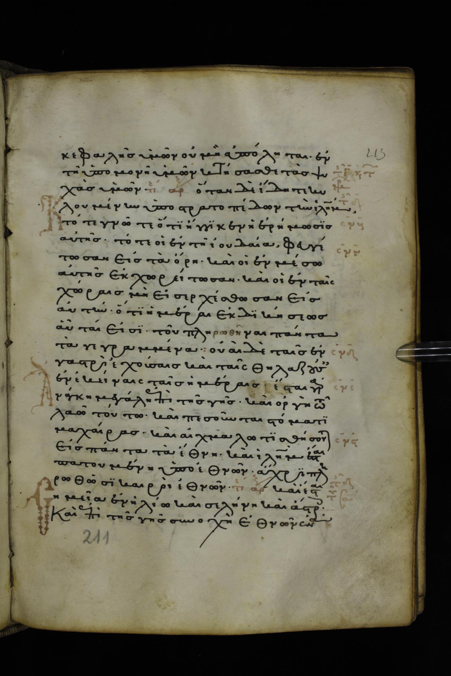 Thirteenth or fourteenth century minuscule of the Gospels on parchment; 312 leaves, 1 column, 19-22 lines per column. Images were taken at the National Library of Greece in Athens.