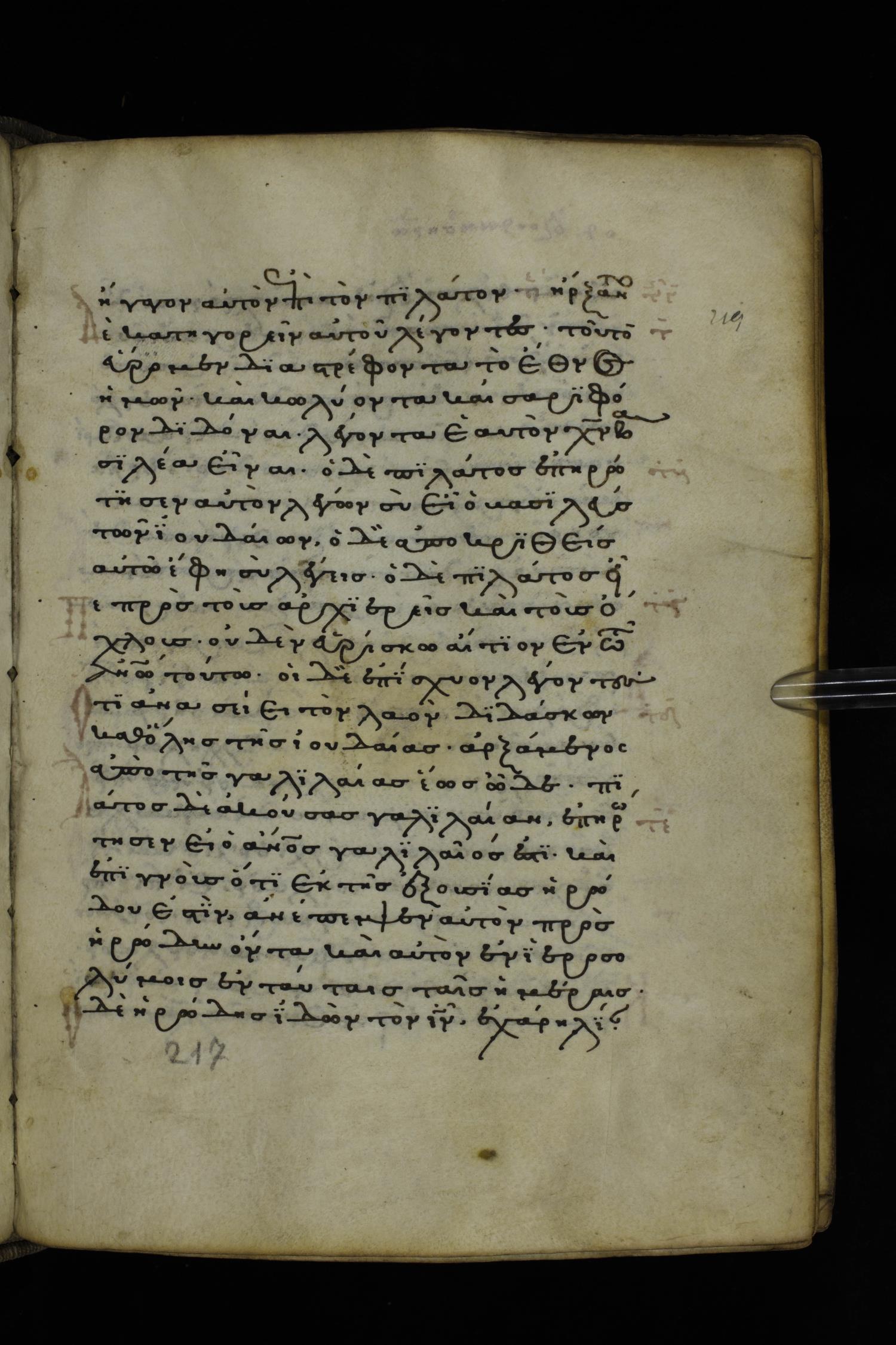 Thirteenth or fourteenth century minuscule of the Gospels on parchment; 312 leaves, 1 column, 19-22 lines per column. Images were taken at the National Library of Greece in Athens.
