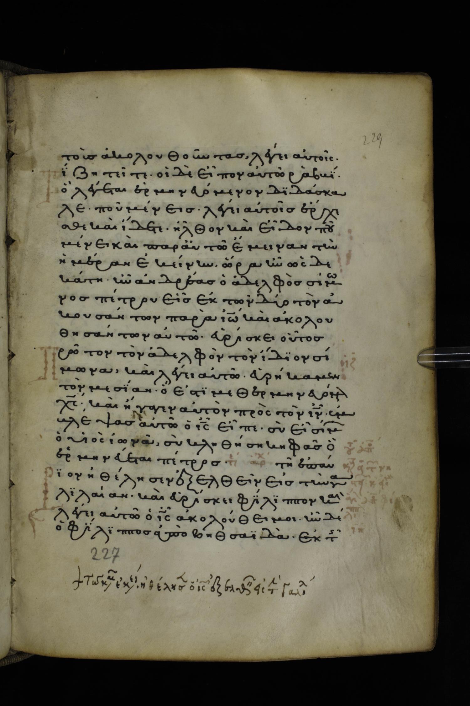 Thirteenth or fourteenth century minuscule of the Gospels on parchment; 312 leaves, 1 column, 19-22 lines per column. Images were taken at the National Library of Greece in Athens.