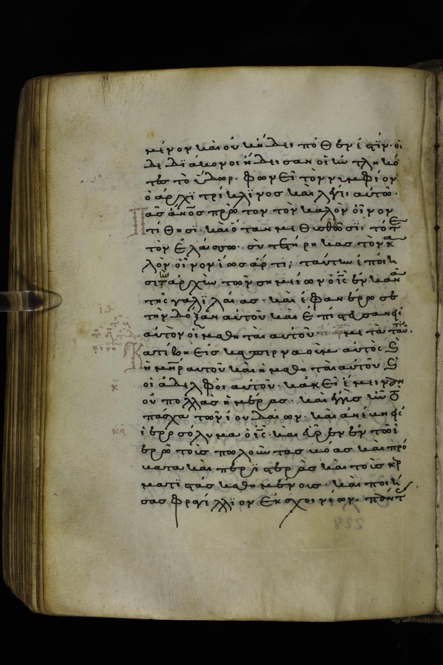 Thirteenth or fourteenth century minuscule of the Gospels on parchment; 312 leaves, 1 column, 19-22 lines per column. Images were taken at the National Library of Greece in Athens.