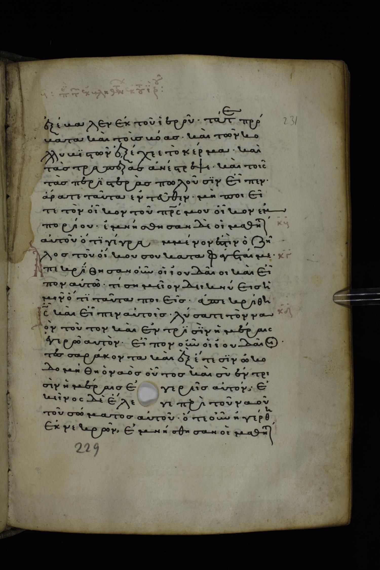 Thirteenth or fourteenth century minuscule of the Gospels on parchment; 312 leaves, 1 column, 19-22 lines per column. Images were taken at the National Library of Greece in Athens.