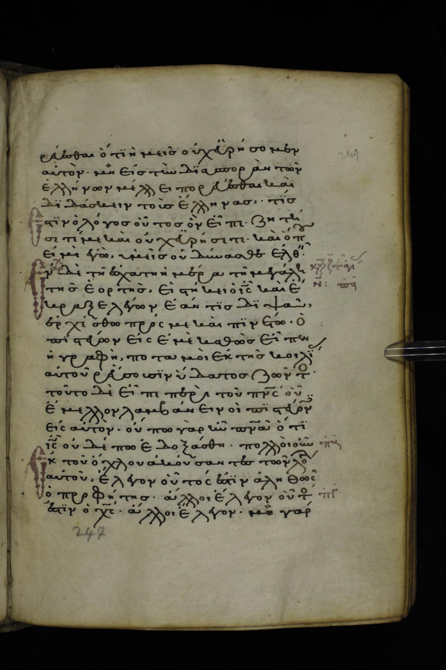 Thirteenth or fourteenth century minuscule of the Gospels on parchment; 312 leaves, 1 column, 19-22 lines per column. Images were taken at the National Library of Greece in Athens.