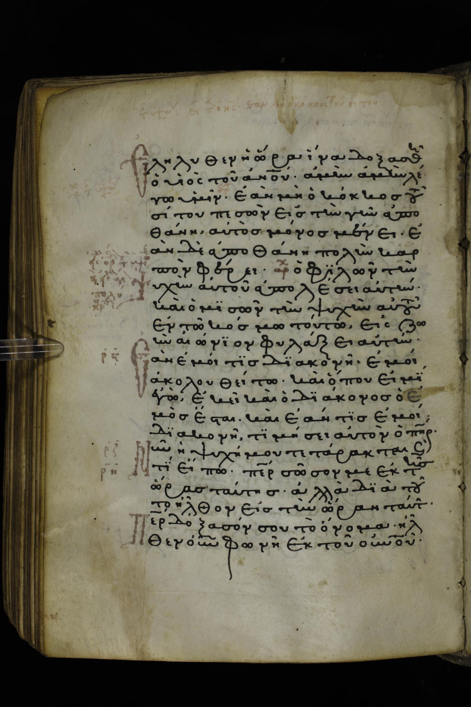 Thirteenth or fourteenth century minuscule of the Gospels on parchment; 312 leaves, 1 column, 19-22 lines per column. Images were taken at the National Library of Greece in Athens.