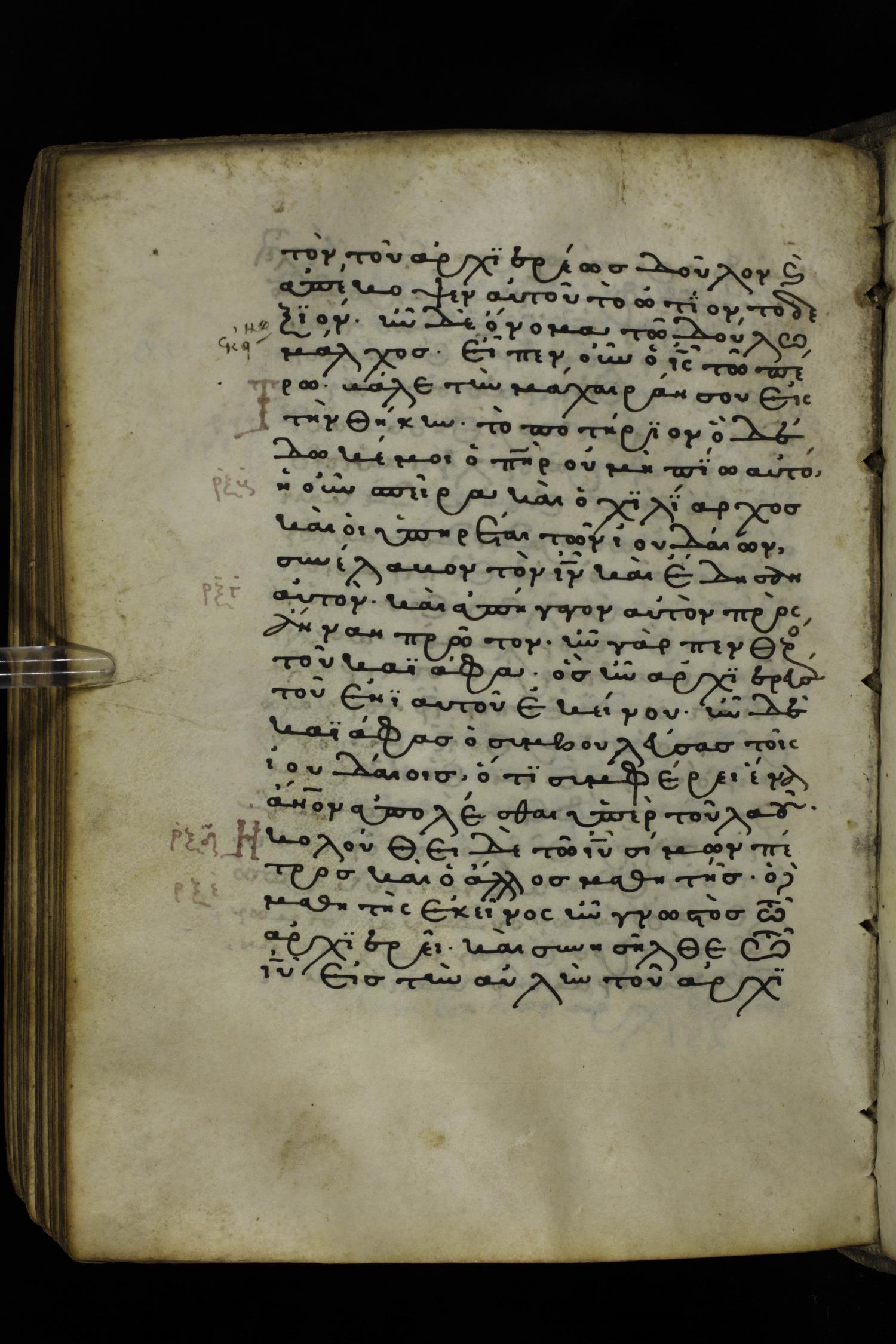 Thirteenth or fourteenth century minuscule of the Gospels on parchment; 312 leaves, 1 column, 19-22 lines per column. Images were taken at the National Library of Greece in Athens.