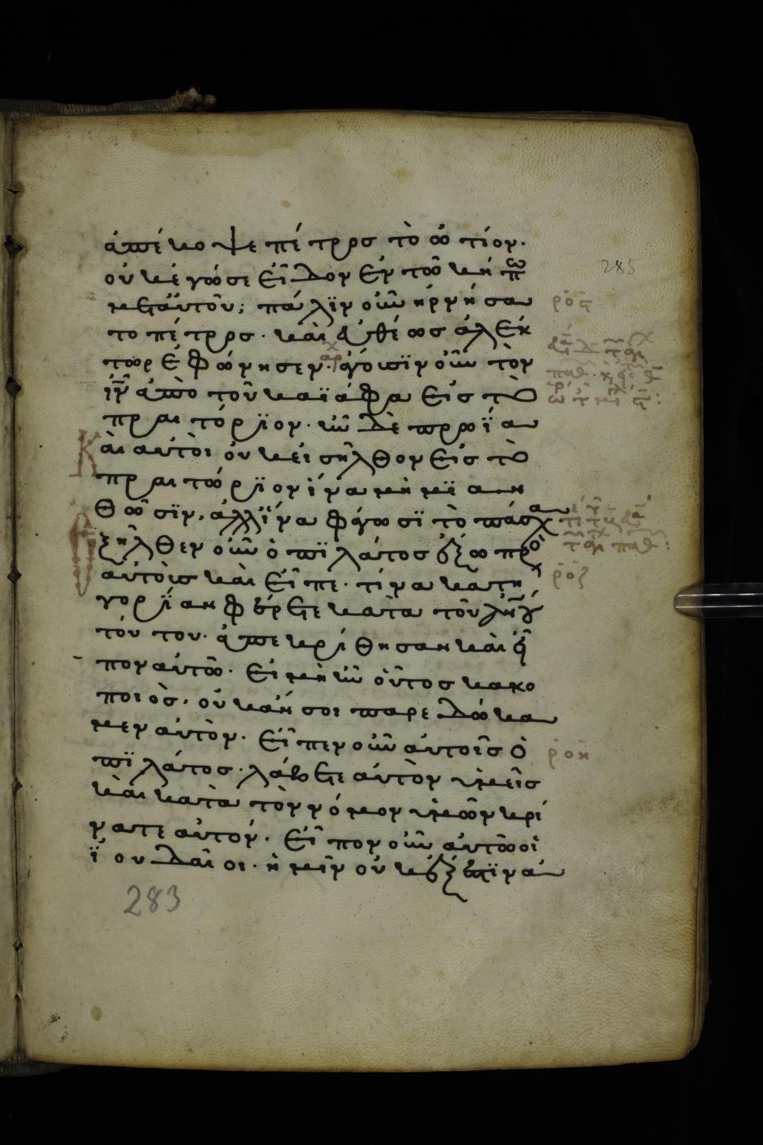 Thirteenth or fourteenth century minuscule of the Gospels on parchment; 312 leaves, 1 column, 19-22 lines per column. Images were taken at the National Library of Greece in Athens.