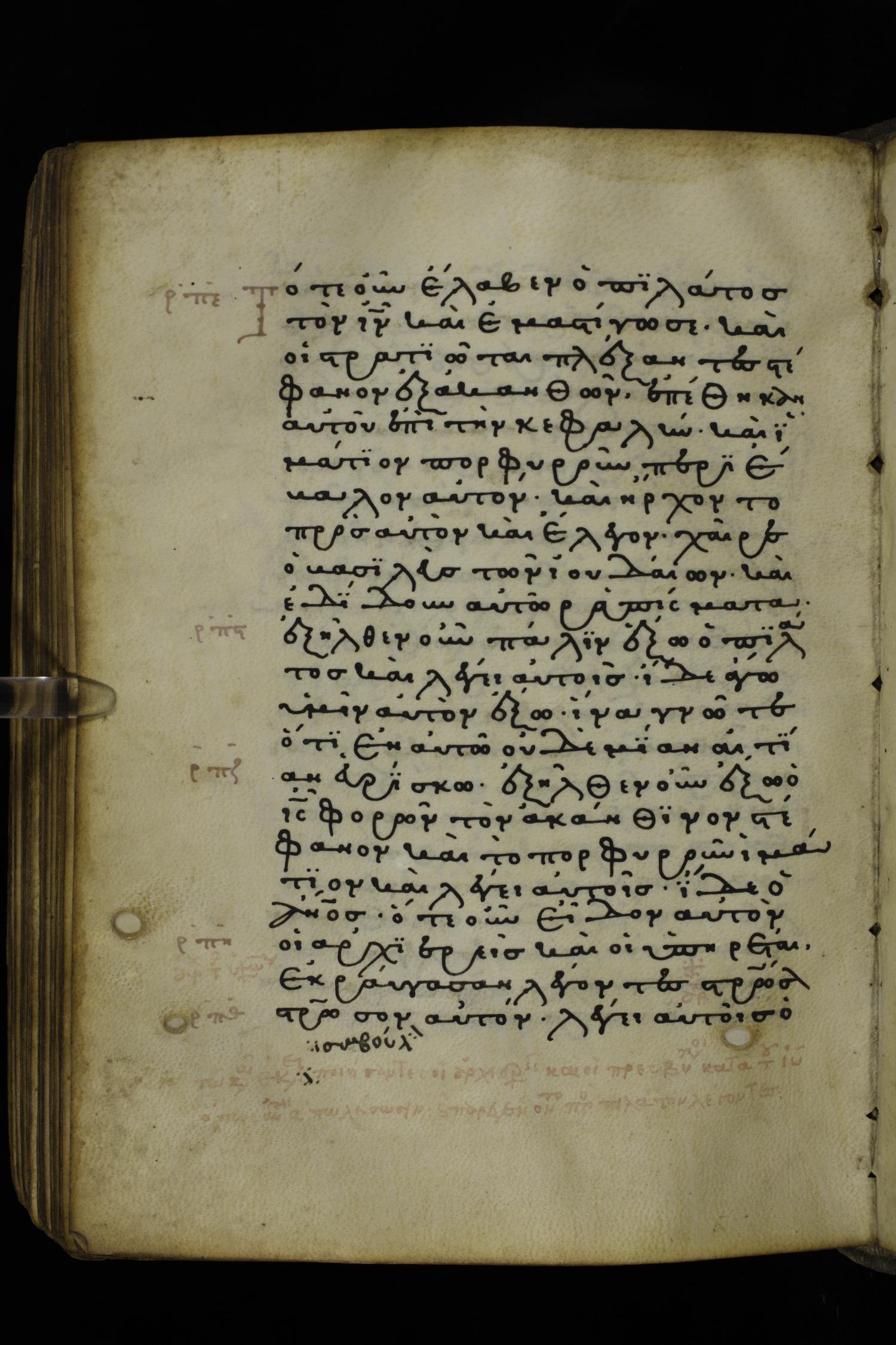 Thirteenth or fourteenth century minuscule of the Gospels on parchment; 312 leaves, 1 column, 19-22 lines per column. Images were taken at the National Library of Greece in Athens.