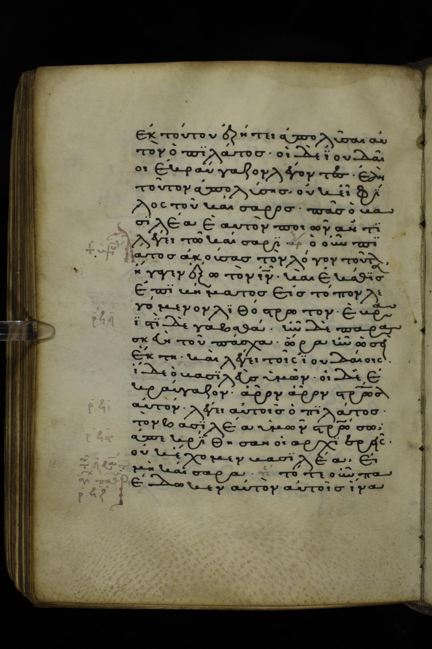 Thirteenth or fourteenth century minuscule of the Gospels on parchment; 312 leaves, 1 column, 19-22 lines per column. Images were taken at the National Library of Greece in Athens.